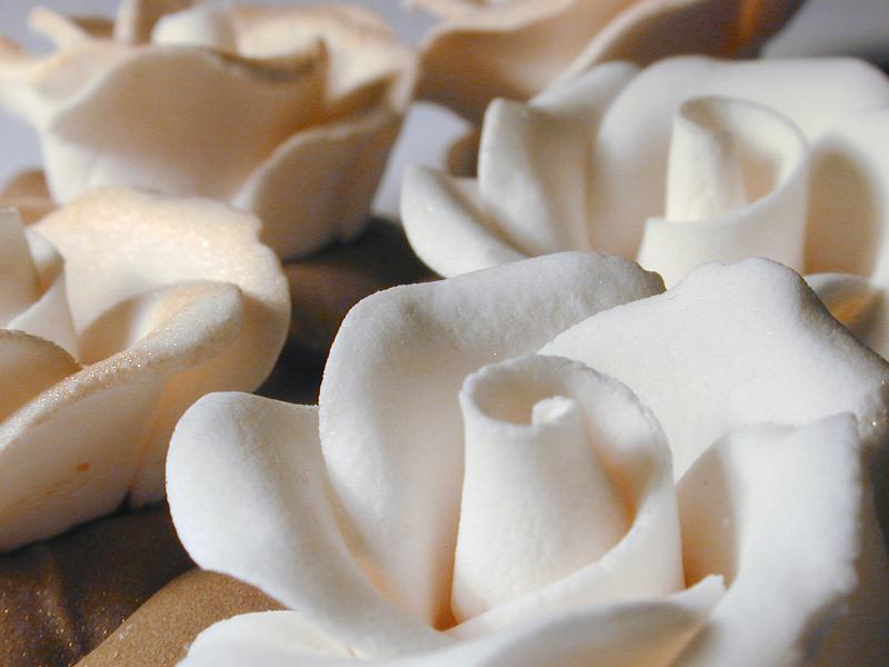 Image Description: Close up of white icing sugar roses ready to be used in baking to decorate a cake