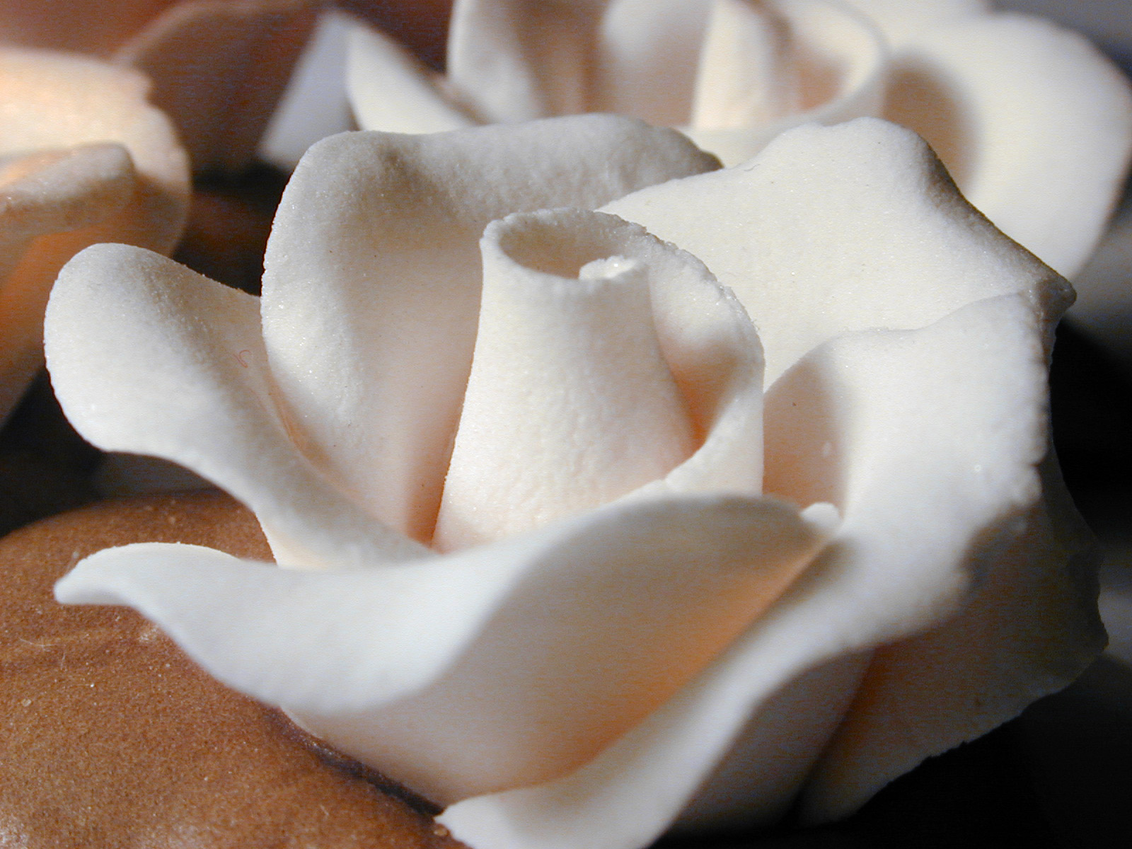 Image Description: Ornamental white icing sugar rose for decorating cakes at a bakery or home baking, close up side view