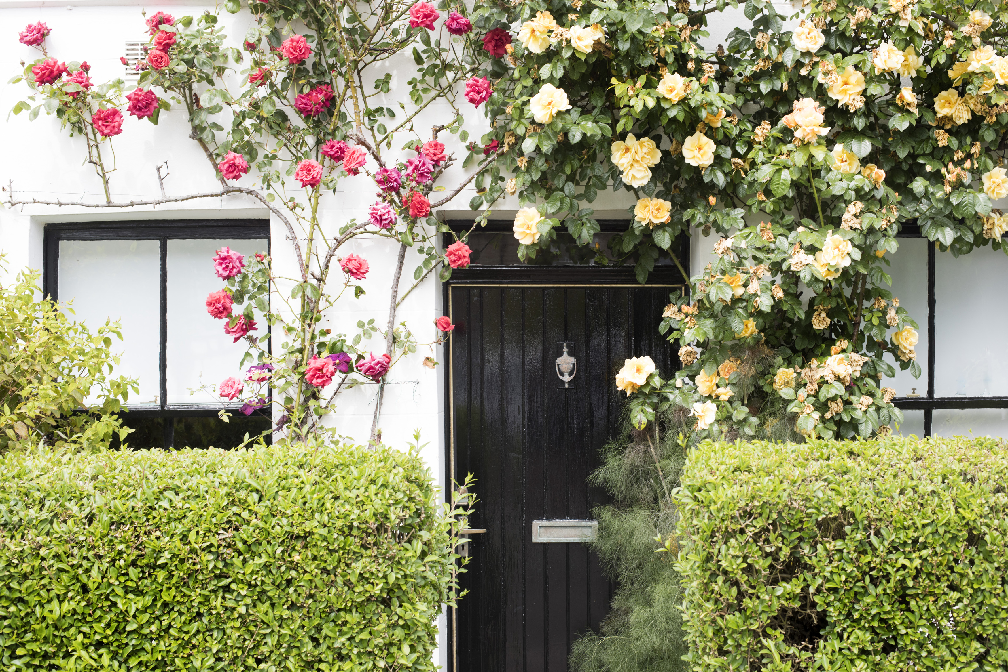 Image Description: Cottage door with trailing red and yellow roses forming a decorative arch over the wall viewed between two neat trimmed hedges