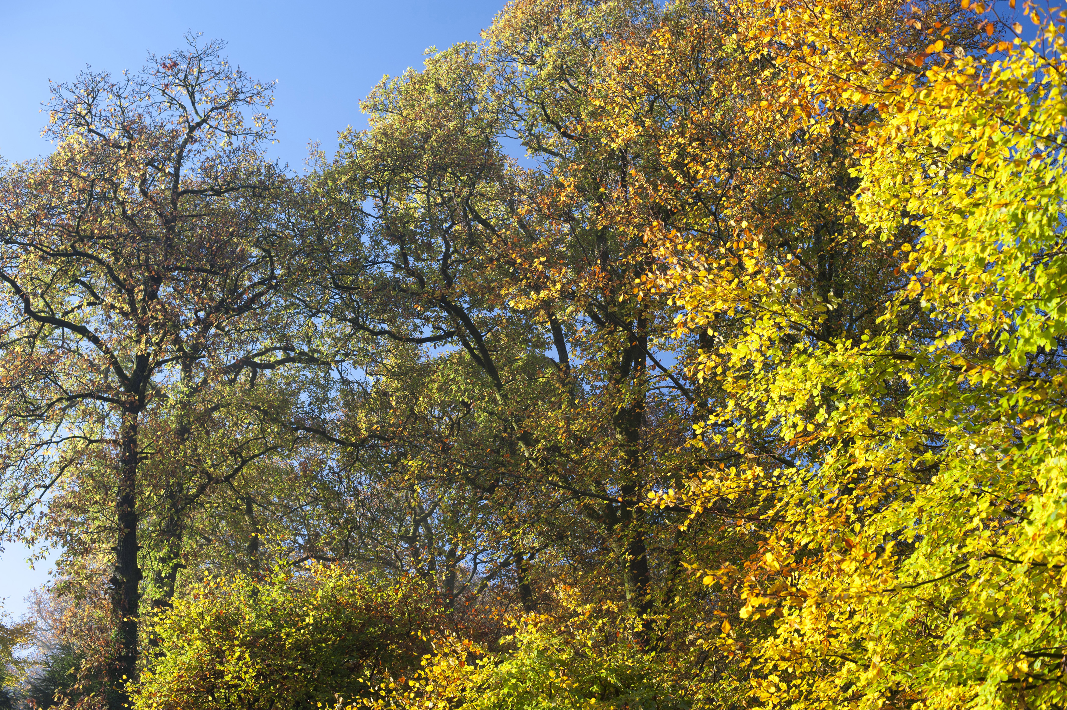 Image Description: Colorful autumn or fall foliage with the leaves on the trees in woodland turning a vivid yellow with the changing of the seasons, against a clear sunny blue sky