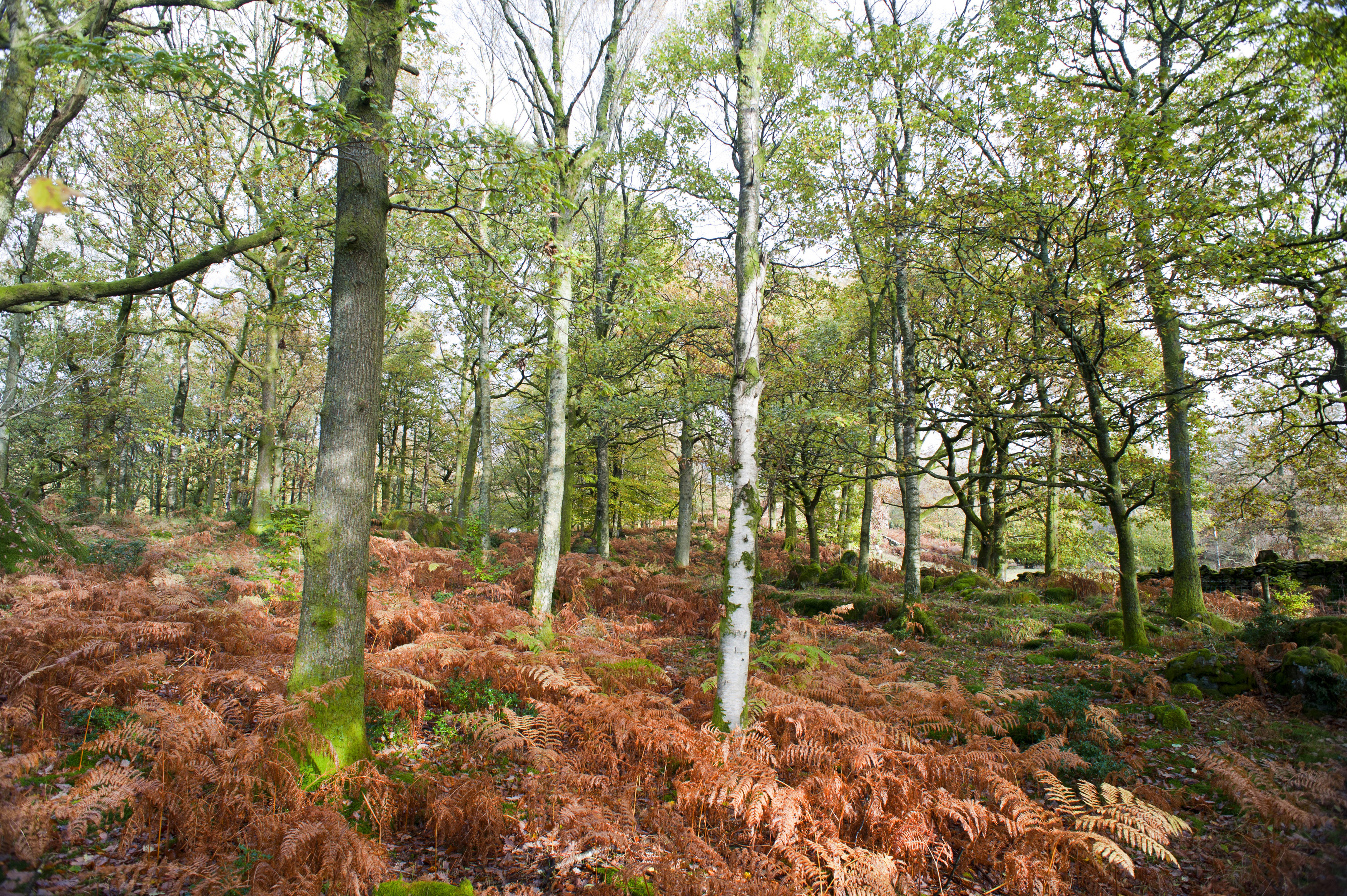 Image Description: Autumn or fall woodland landscape with brown bracken carpeting the floor beneath the trees marking the changing season
