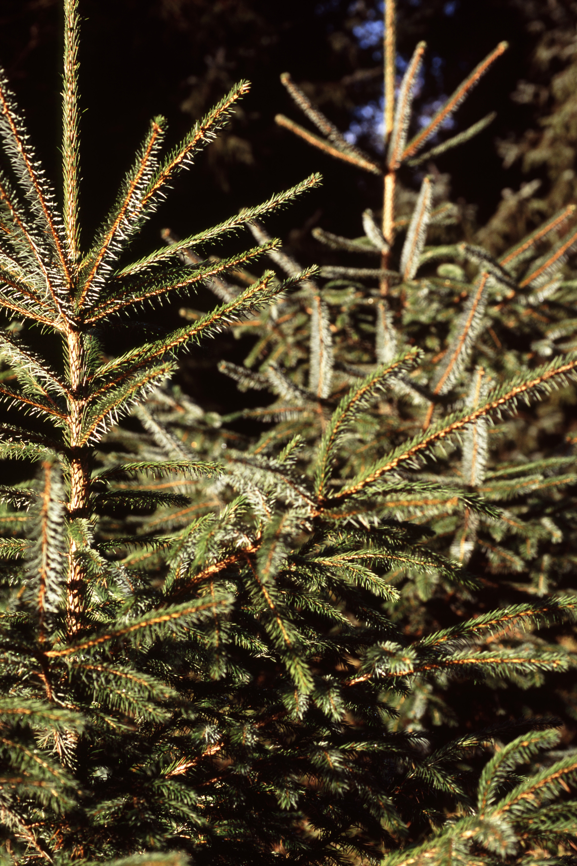 Image Description: Nature Close Up of Tops and Branches of Young Evergreen Trees in Forest on Bright Sunny Day