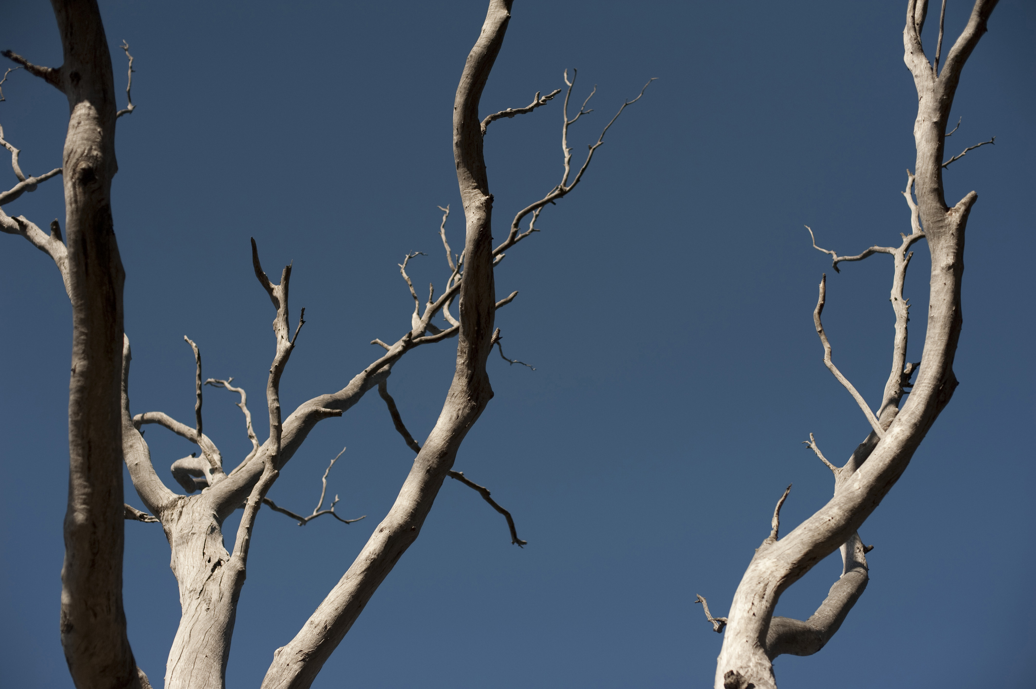 Image Description: Dead tree branches against a clear sunny blue sky showing the life cycle of plants in nature