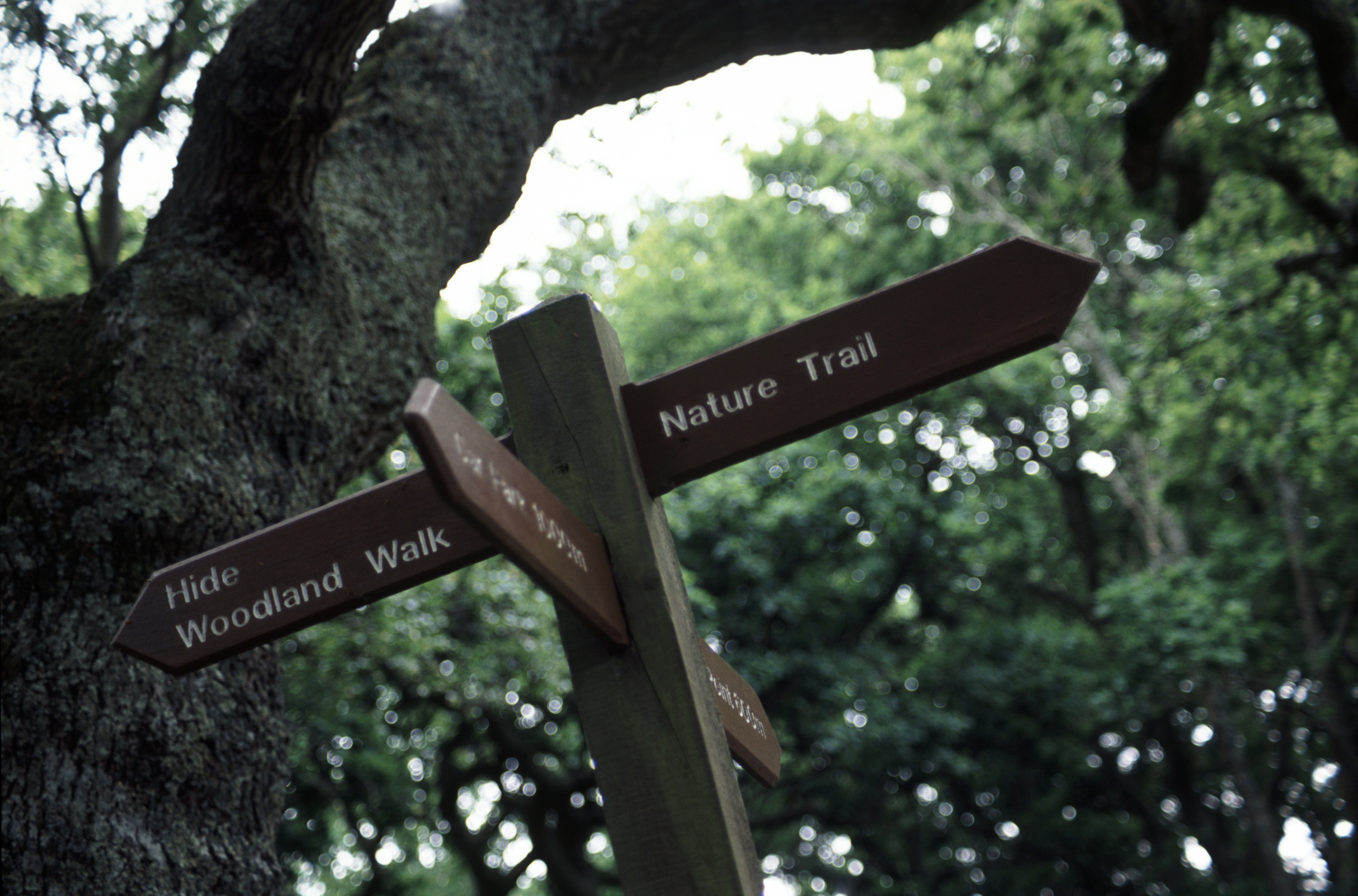 Image Description: Low angle close up view of a rustic wooden footpath sign with arrows pointing to a Nature Trail and Woodland Walk, background of green leafy trees