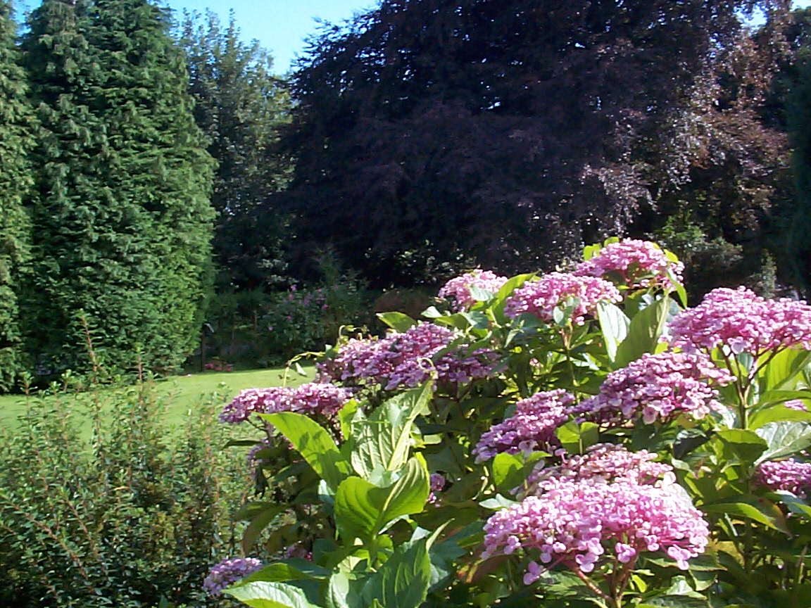 Image Description: Scenic View of Purple Flowers Growing in a Sunny Tree Filled Garden with Clearing