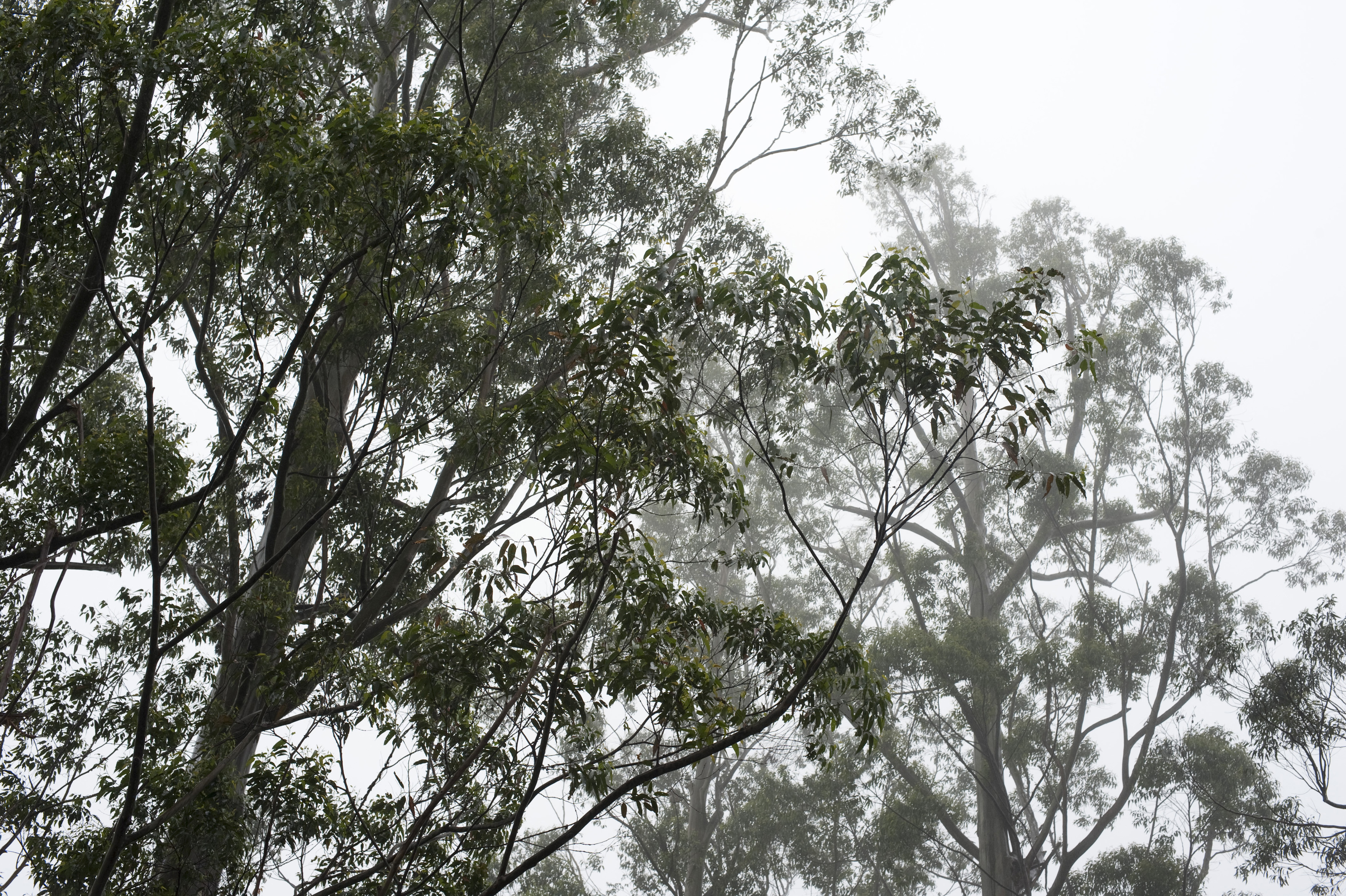 Image Description: looking up a trees on a misty day