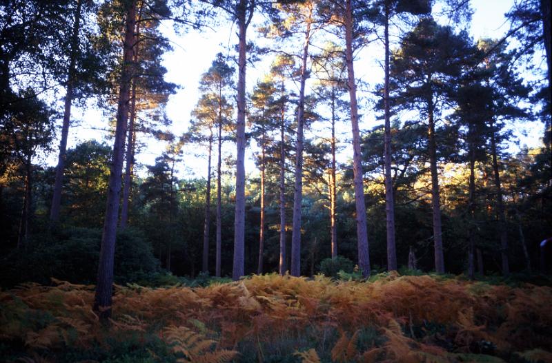 Image Description: last light of day in a pine woodland with side light on the trees and shade on the forest floor