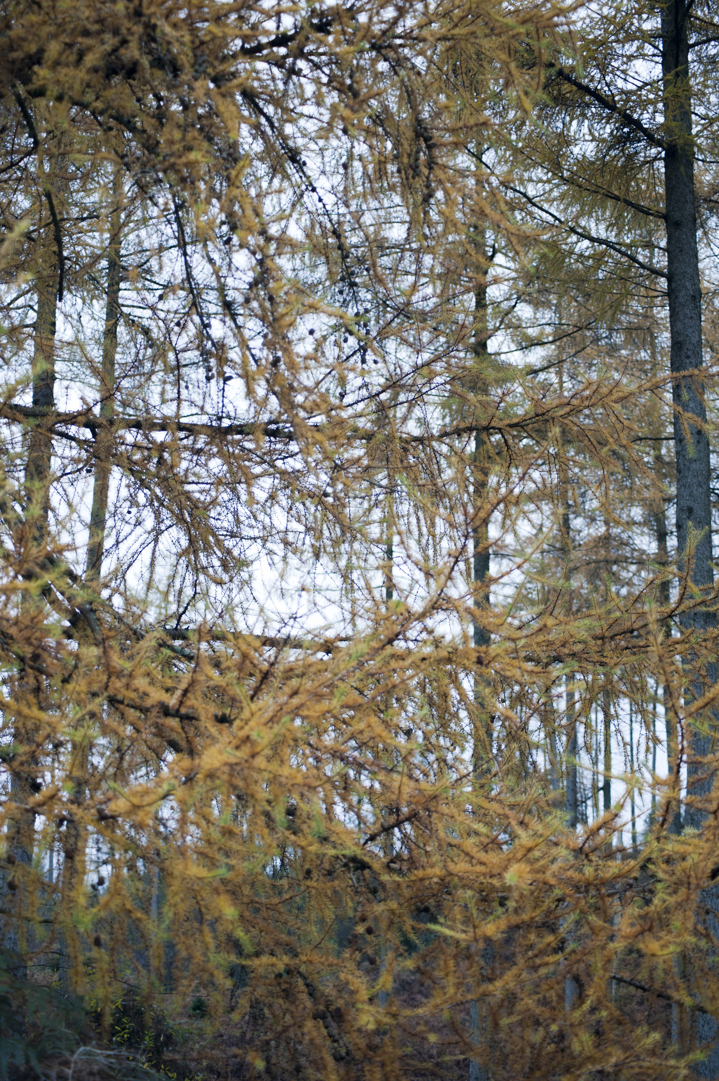 Image Description: Close Up of Yellow Pine Tree Larch in Deciduous Evergreen Forest, Ideal for Backgrounds