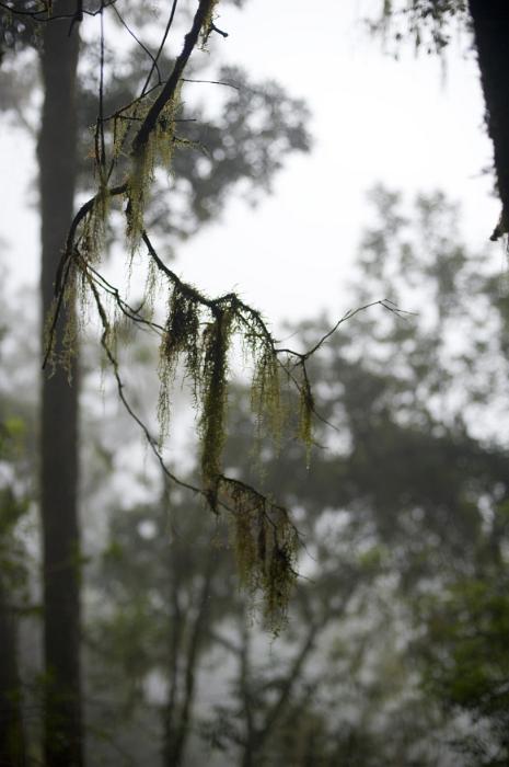 Image Description: Tree branch with Beard Lichens hanging from it with defocused trees in the background