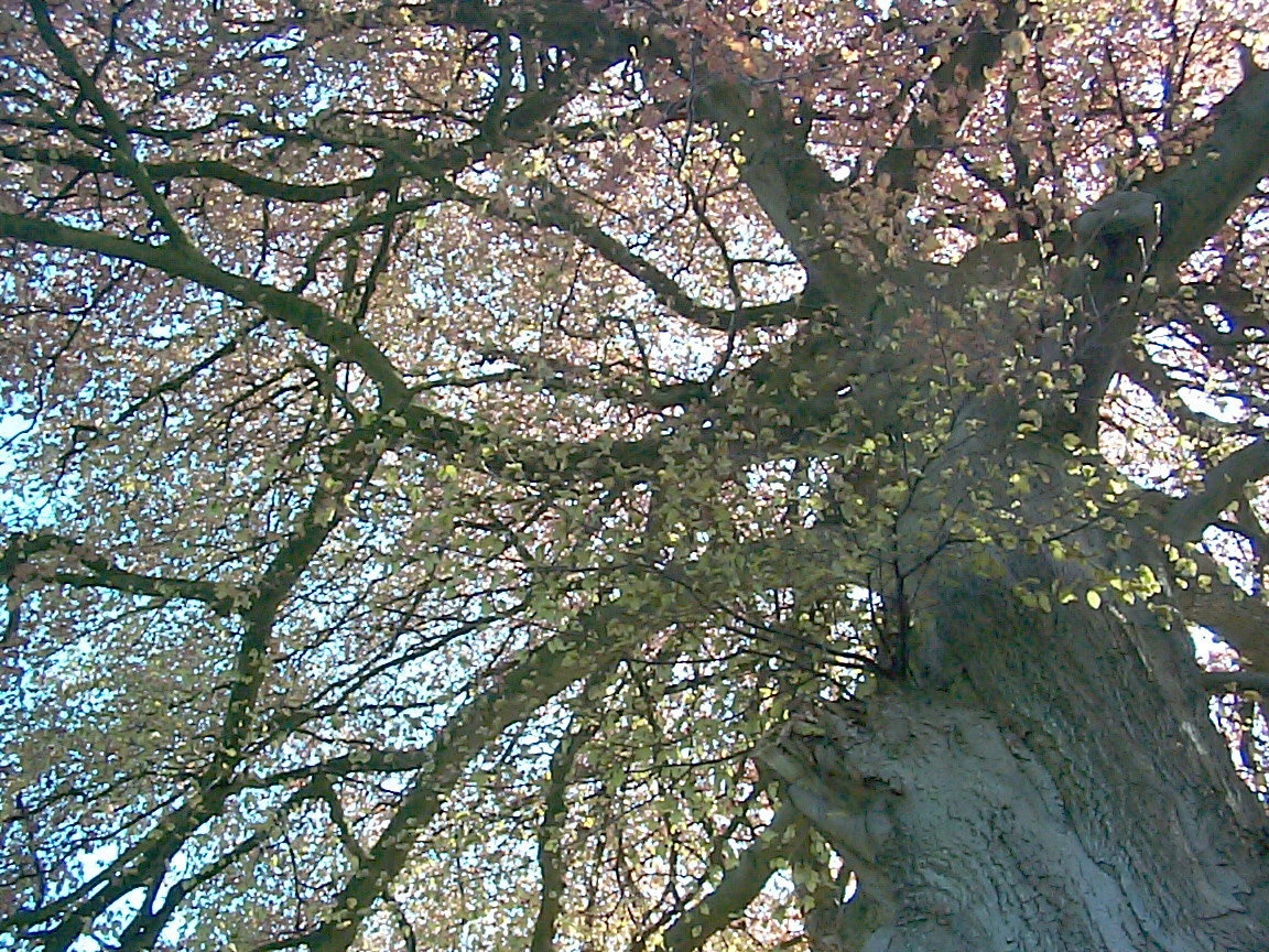 Image Description: Looking up a the limbs and branches of a beech tree in winter