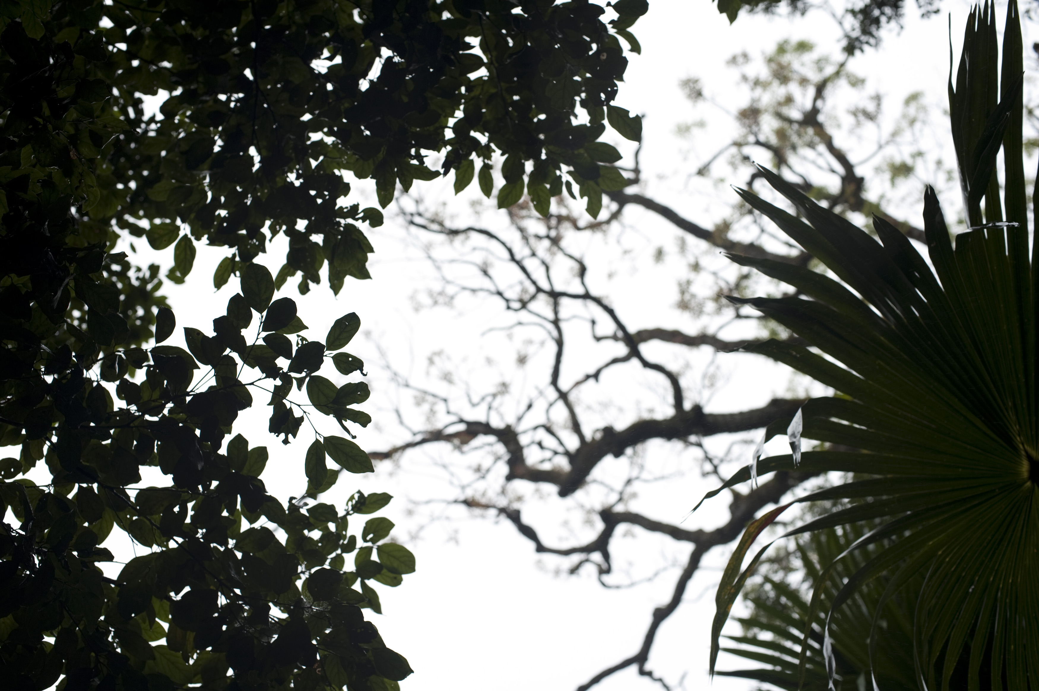 Image Description: Low Angle View of Lush Forest Foliage Silhouetted Against Day Sky - Variety of Plants and Tree Branches as seen from Below