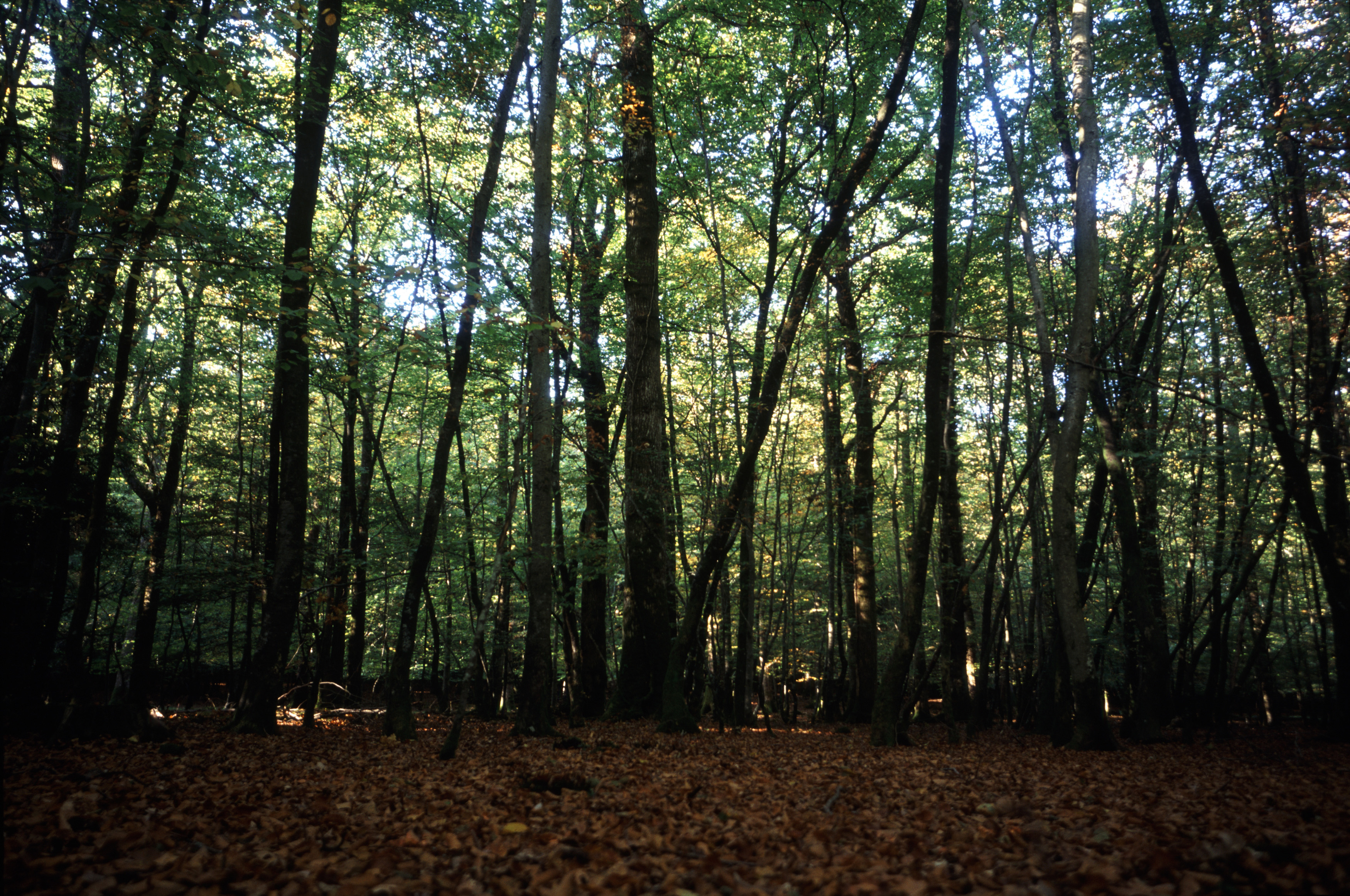 Image Description: A leaf covered clearing in an english woodland surrounded by trees
