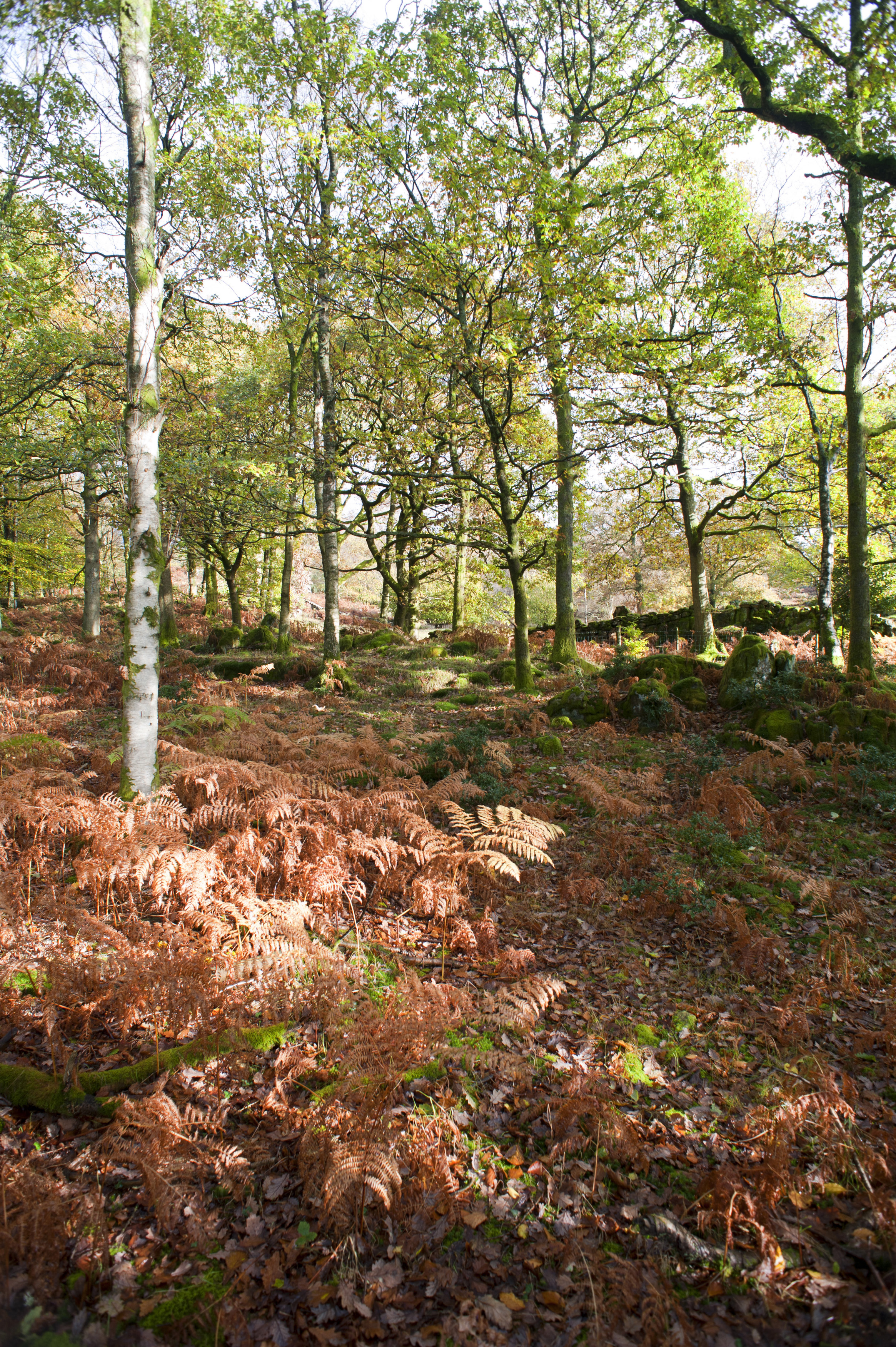 Image Description: Woodland glade with leafy green deciduous trees and brown dried bracken on the ground in a nature or fall background