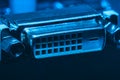 Image Description: Detail view of DVI video connector with yellow metal or gilded pins close-up on white surface with copy space