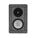 Image Description: Speaker system loudspeaker under black metal lattice installed in black wooden box, close-up square image