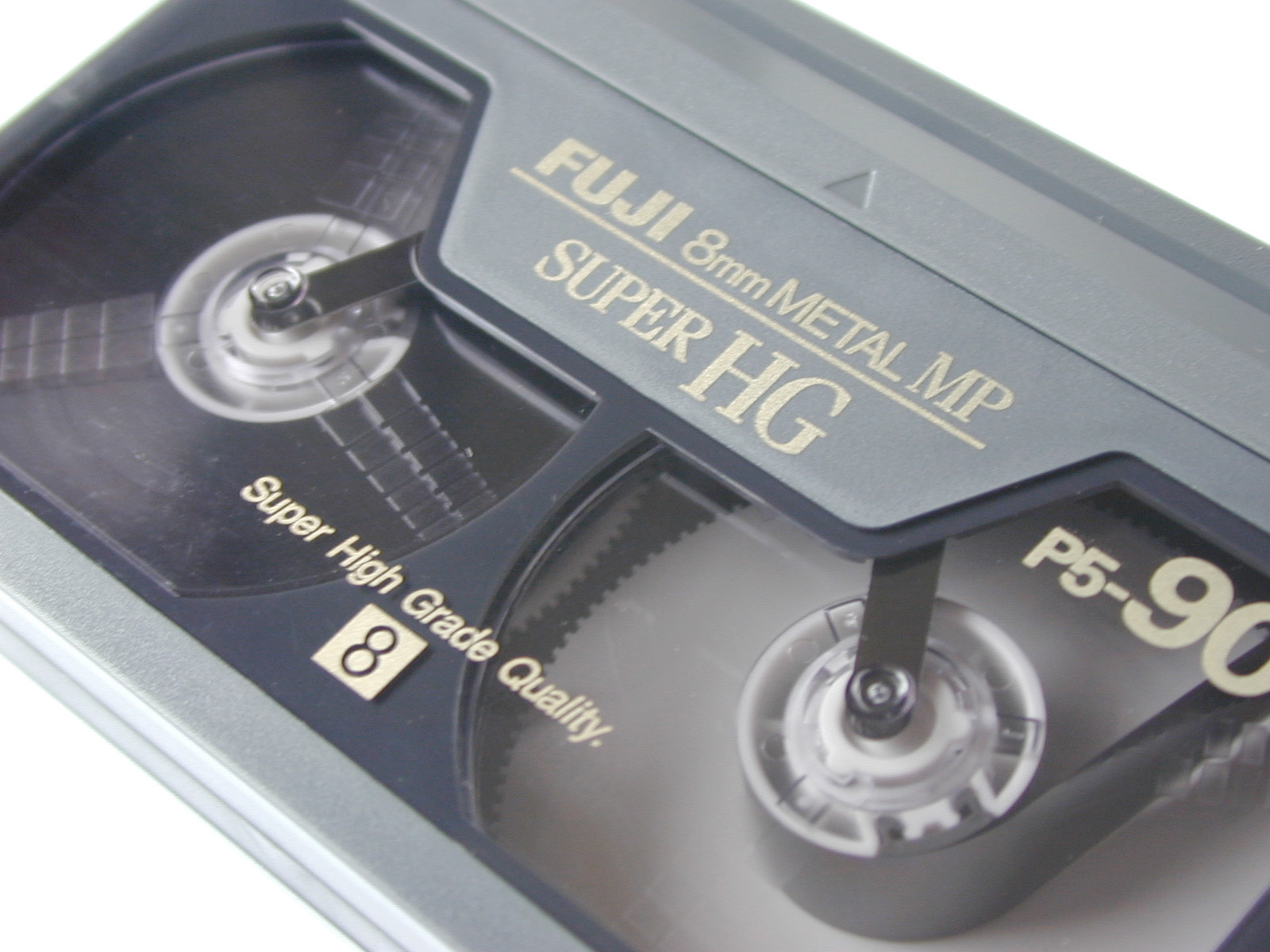 Image Description: Super 8 Fuji VHS video cassette for recording in a closeup view on the transparent plastic case with brand label in an entertainment concept