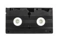 Image Description: Old black plastic video cassette tape with no label isolated on white in an entertainment and communication concept