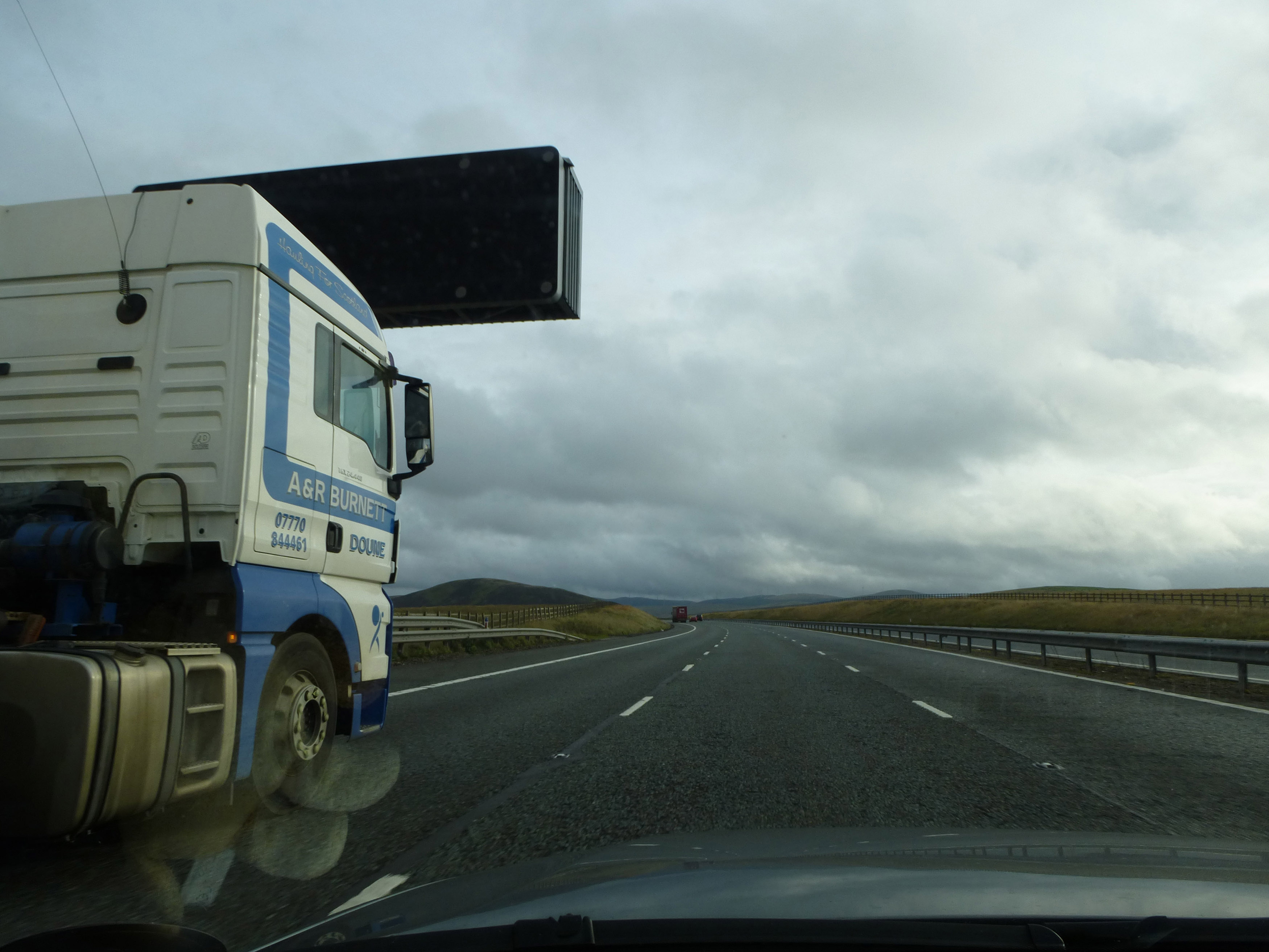 Image Description: Truck driving along a highway taken from the perspective of a car alongside showing the cab and the open road
