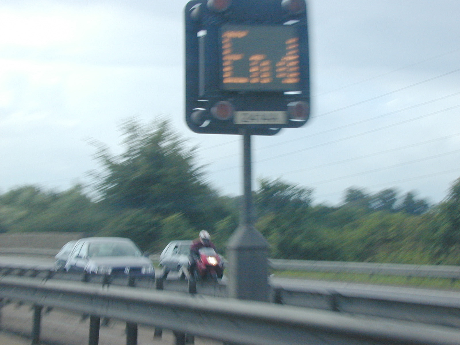 Image Description: Blurry image taken on expressway of sign that reads end as motorcycle speeds by