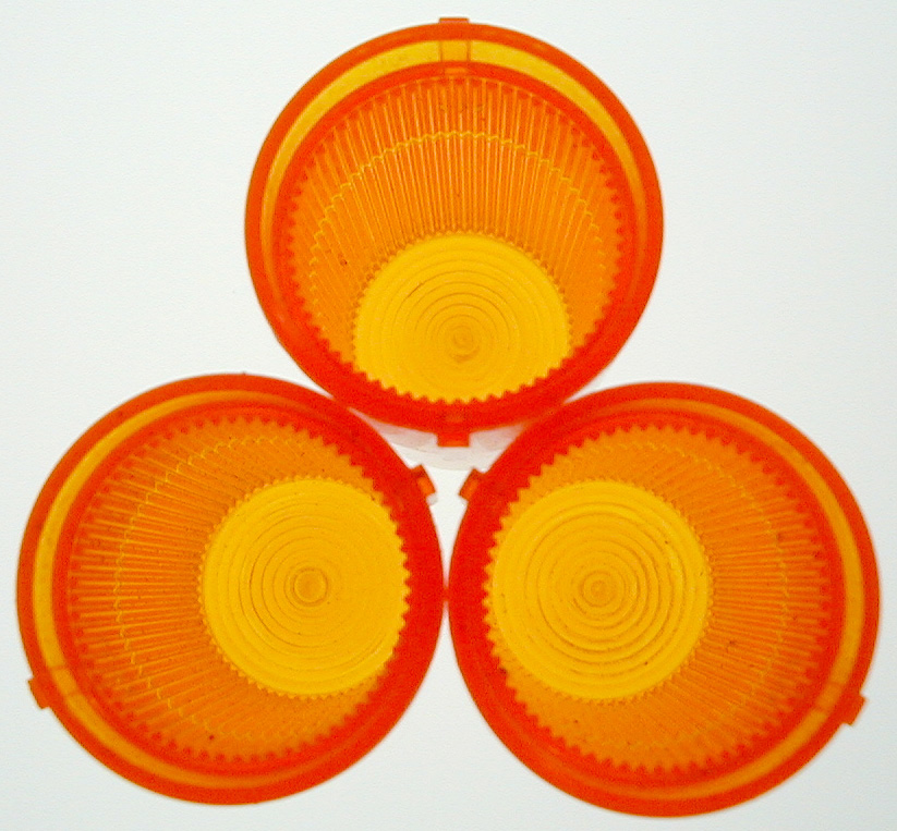 Image Description: Three round orange filters or plastic lenses for car lights and indicators isolated on white