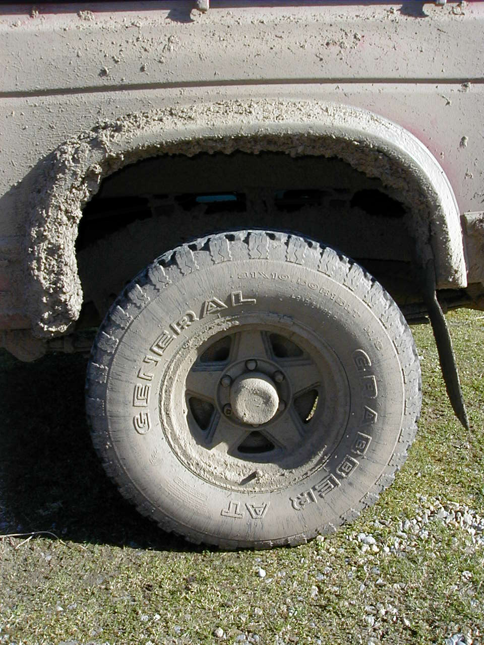 Image Description: Old truck tyre with muddy mudguard parked on a mossy rural gravel road in a close up view