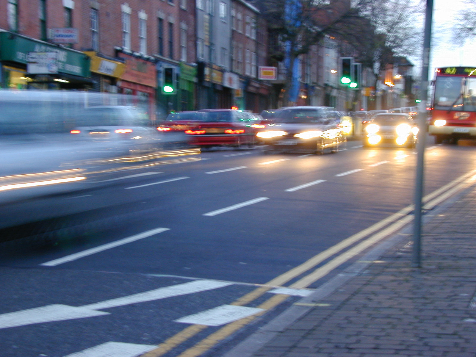 Image Description: Moving stream of vehicles on busy street in the evening.