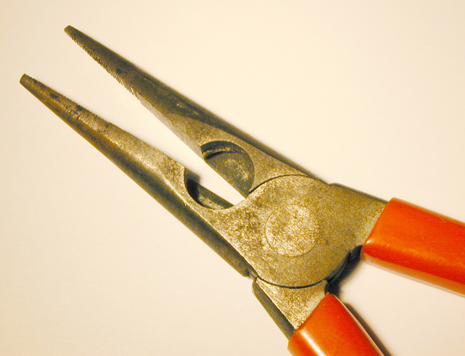 Image Description: Pair of pliers with open jaws on white in a close up partial view from above