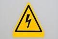 Image Description: a bright yellow risk of electric shock warning triangle