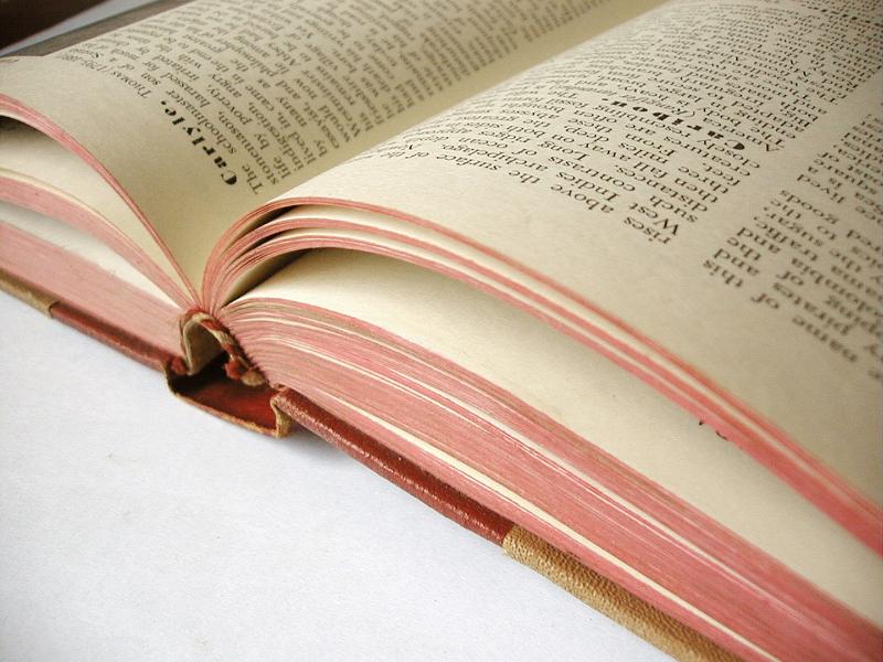 Image Description: Close up of open hard covered book with its edges colored red on a white table