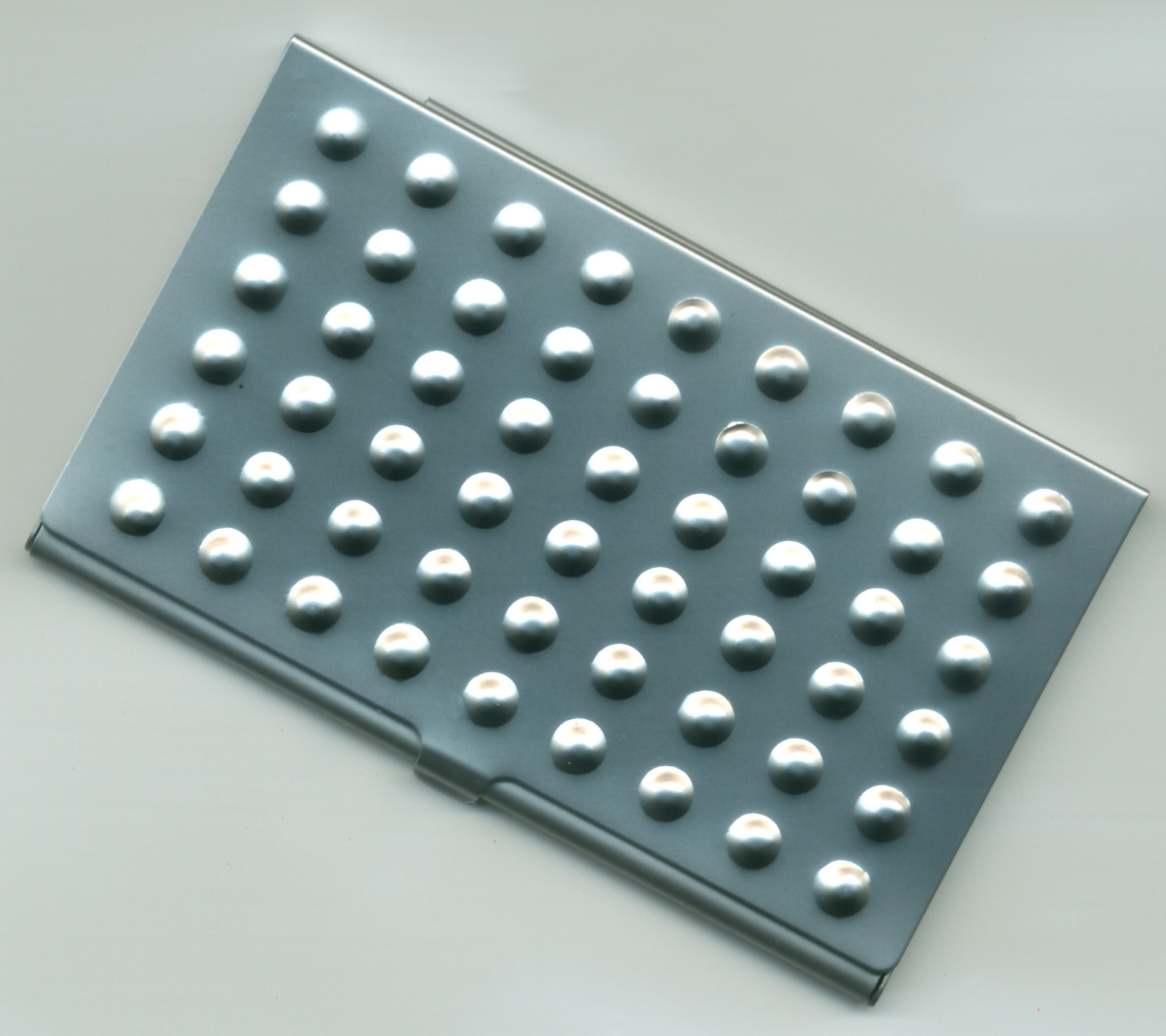 Image Description: Close up overhead view of a metal business cardholder with raised bumps in rows of six