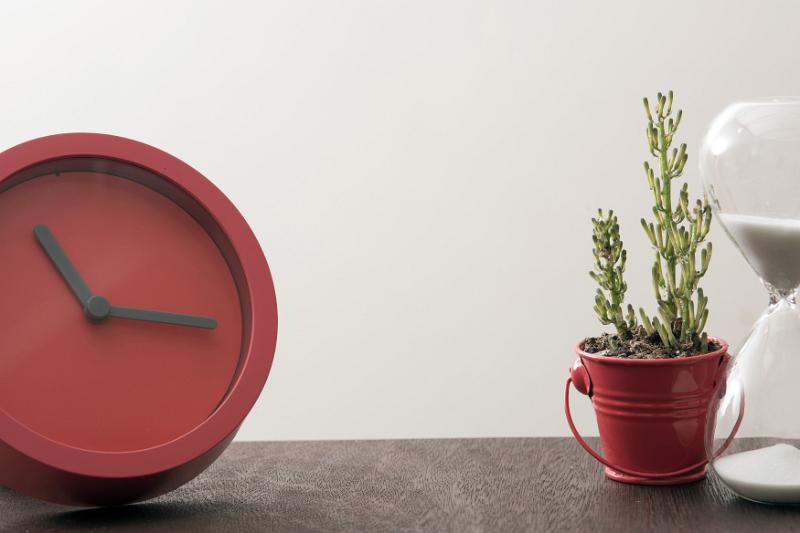 Image Description: Business deadline concept with a modern minimalist red clock on a desk alongside a potted plant in a small pail or bucket, with copy space