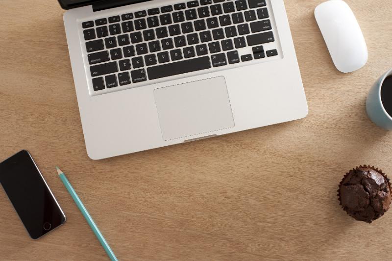 Image Description: Top View of a Wooden Work Table with Laptop Computer, Mobile Phone, Pen and Snacks.