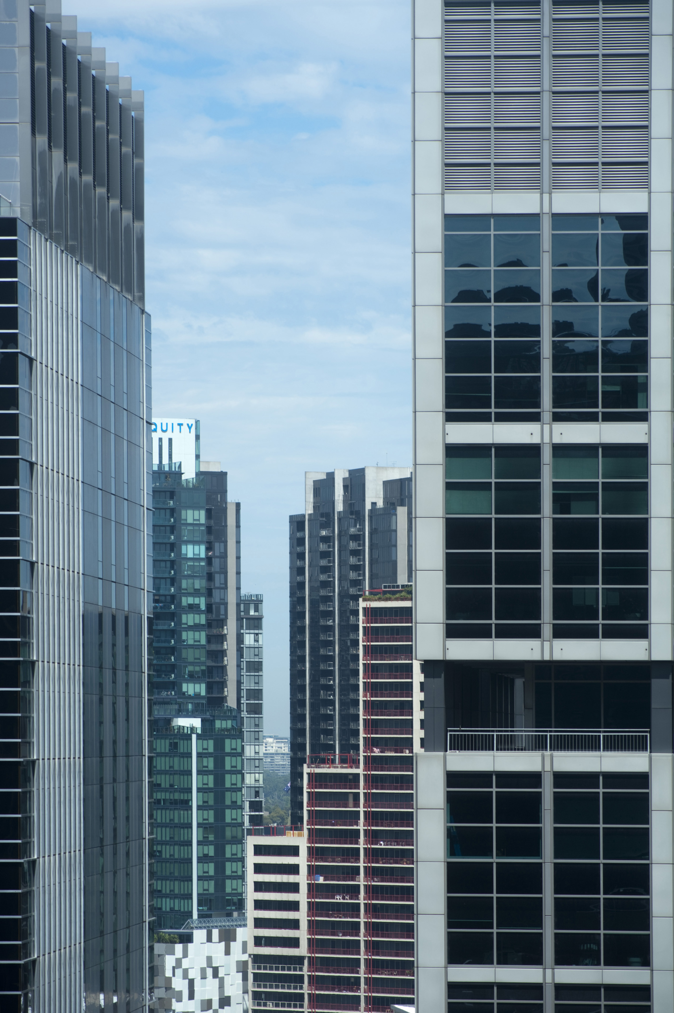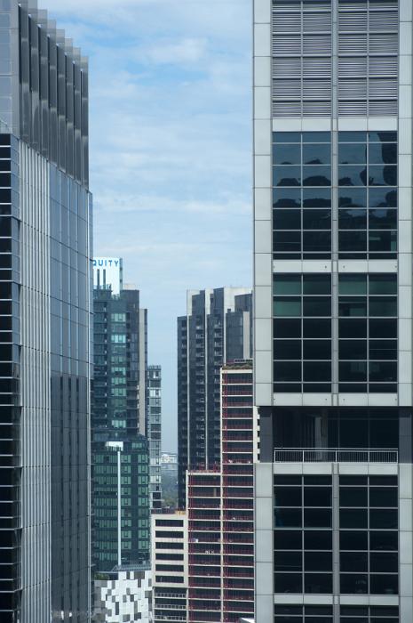 Image Description: Valley of various tall office buildings in large city with copy space in rectangular windows