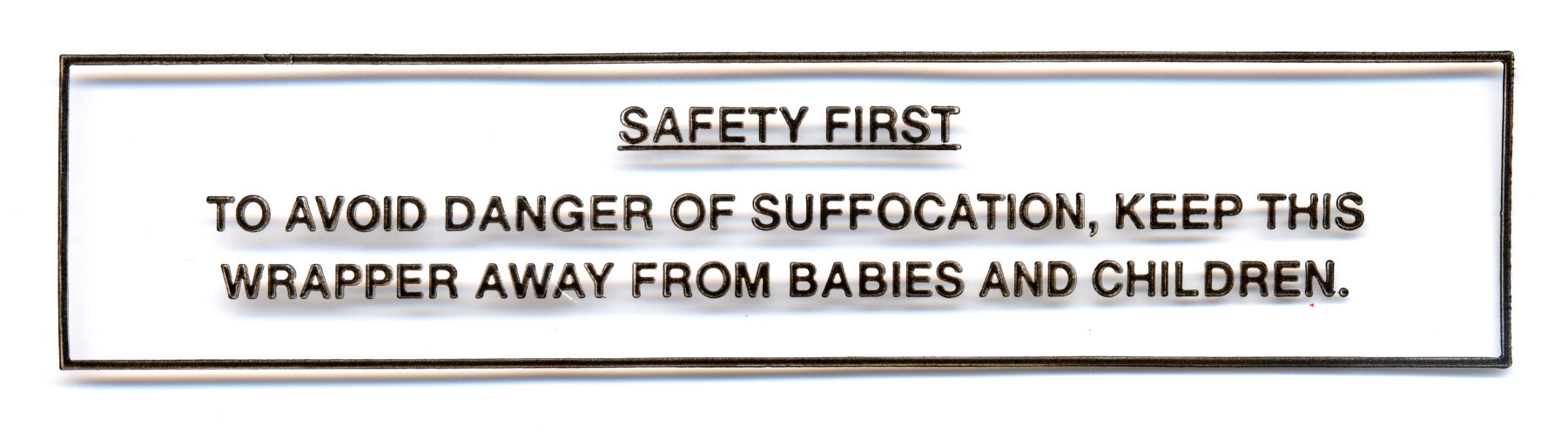 Image Description: Safety first wrapper label warning that the plastic wrapper must be kept out of the reach of babies and children