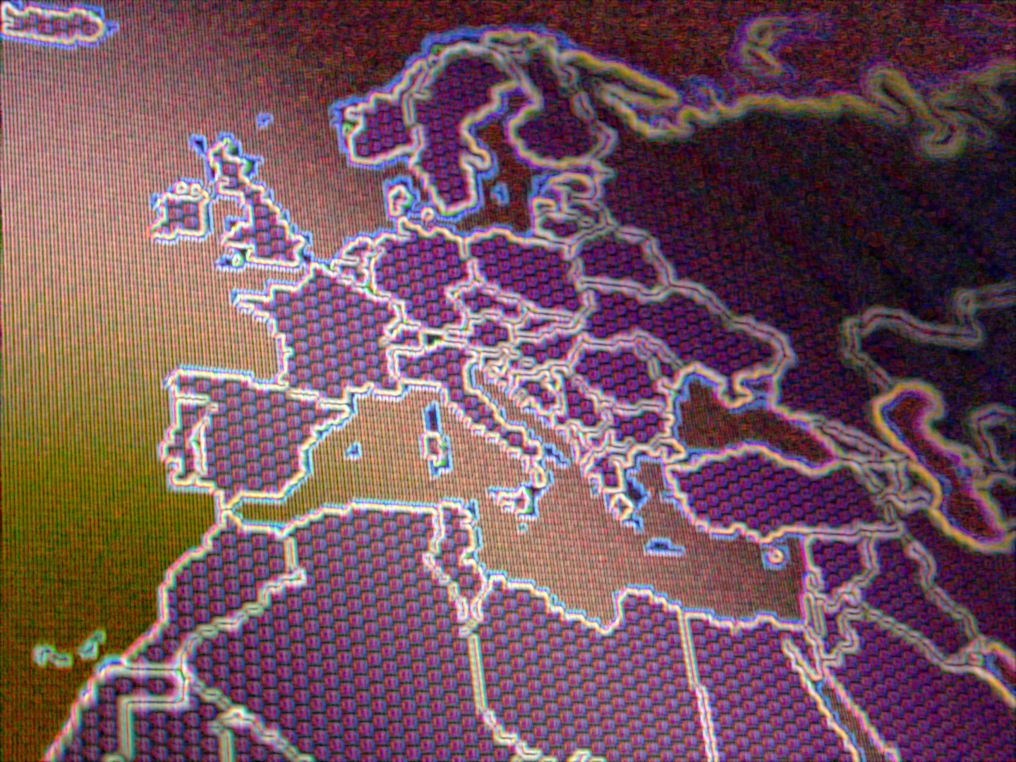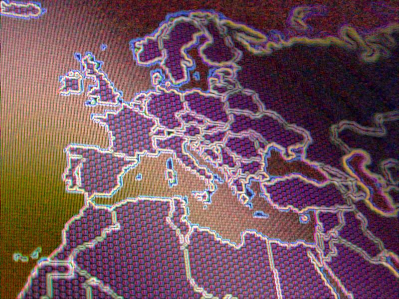 Image Description: Close up on digital map of western Europe and northern Africa in purple and orange colors