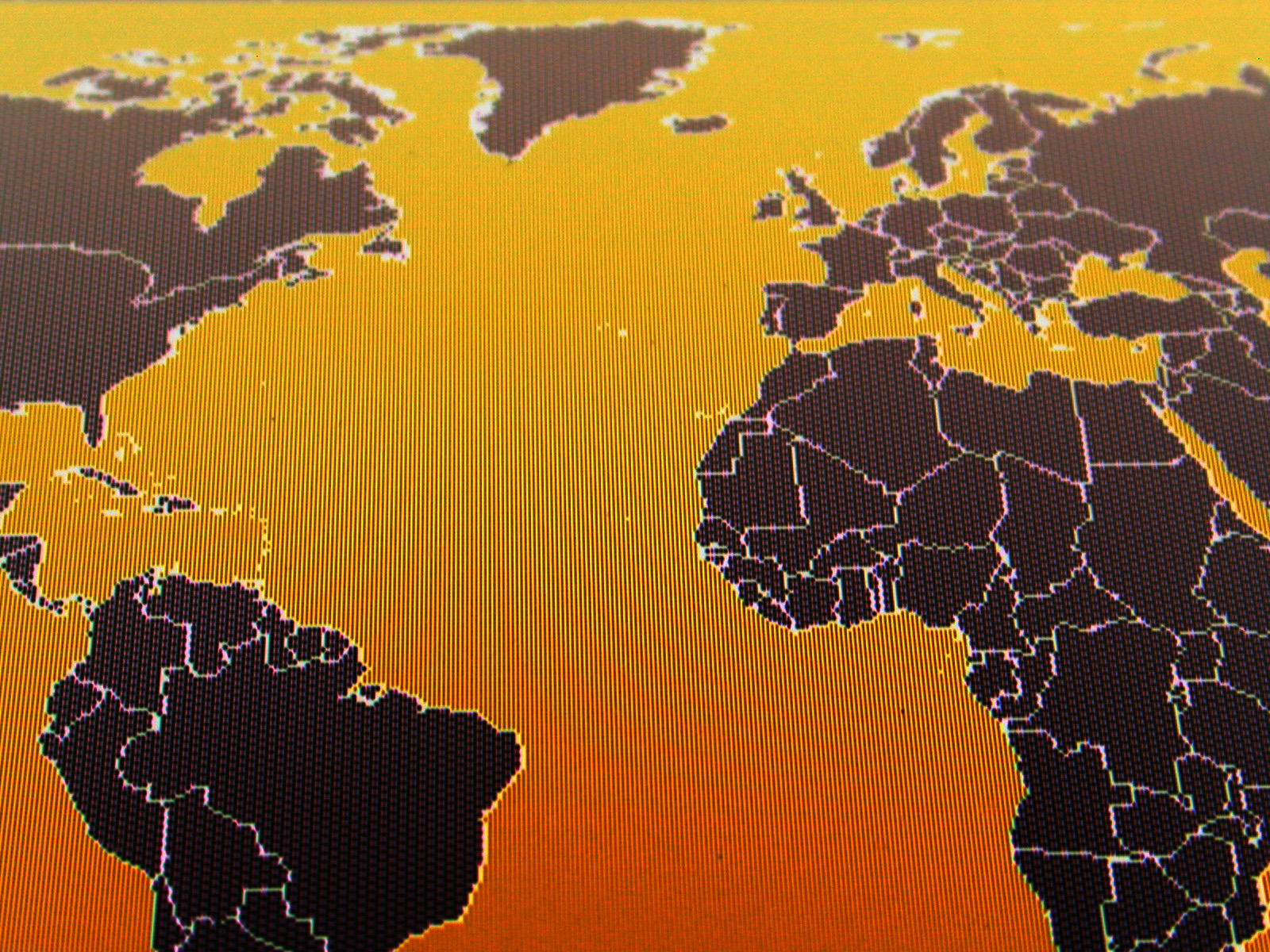 Image Description: Orange seas and brown shaded countries on digital political map with the Americas, Africa and Western Europe