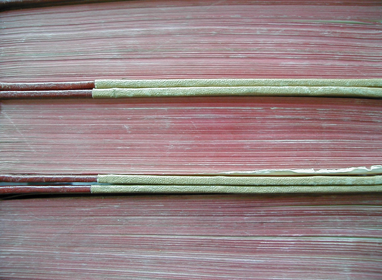 Image Description: Close up detail view on red coated pages on tops of three old green and brown books