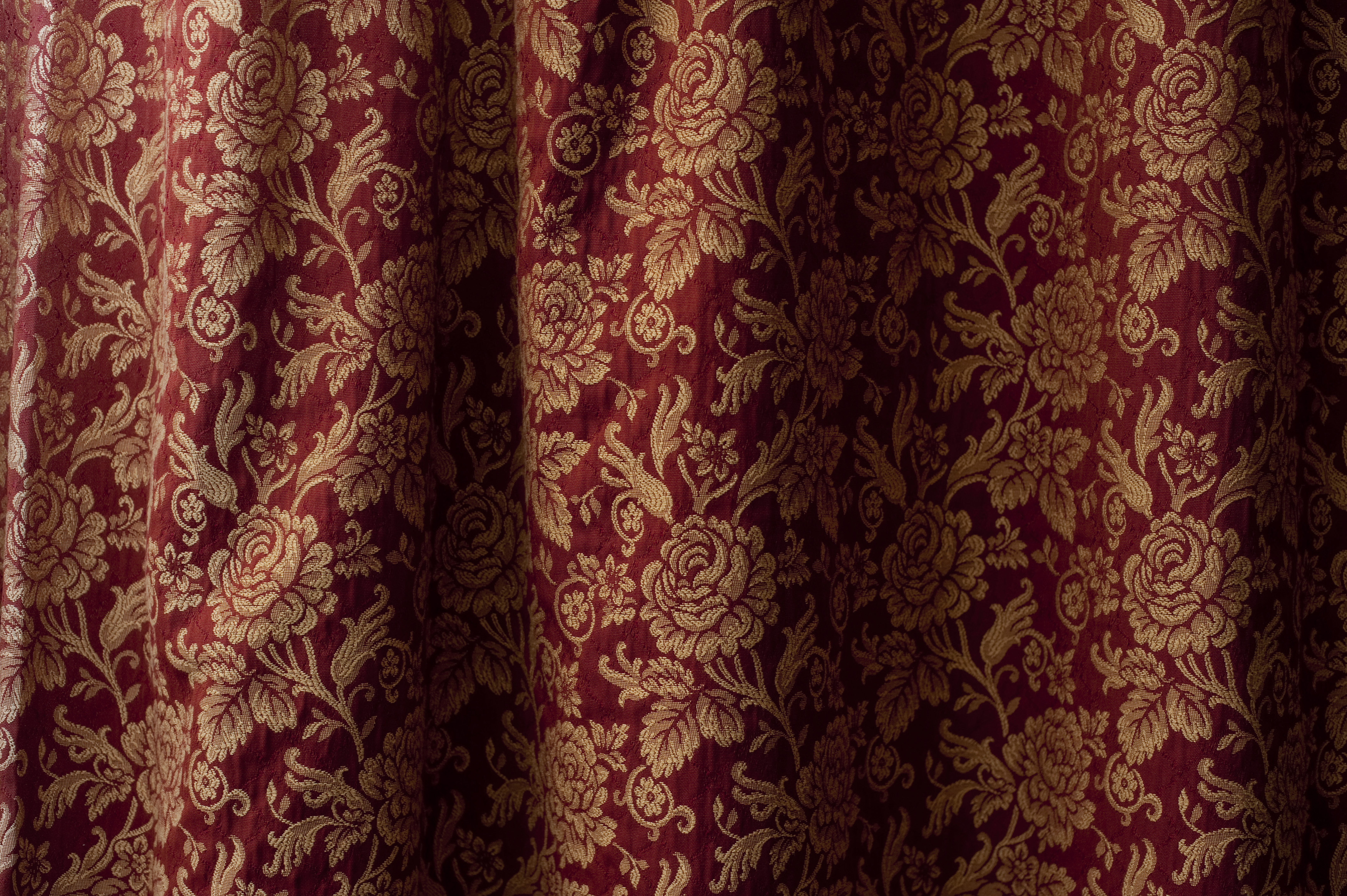 Image Description: Close up on floral pattern in folds of curtain as elegant abstract background with copy space