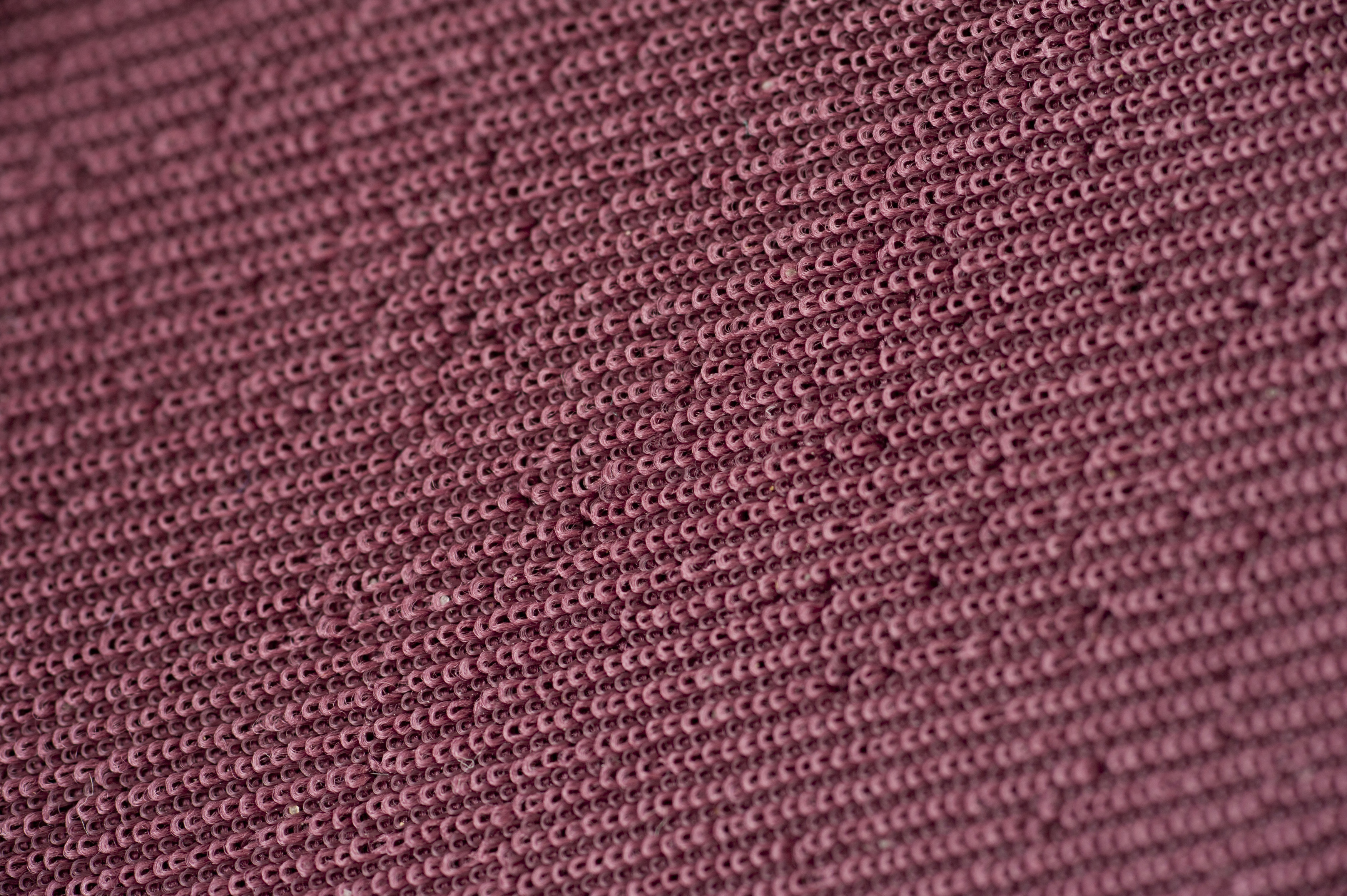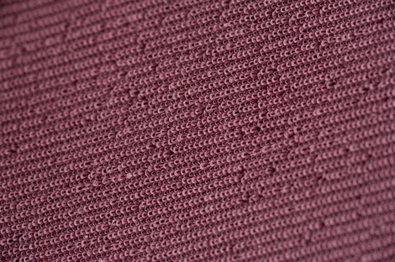 Image Description: Close up on maroon colored little loopy fabric string in rows as abstract background with copy space