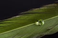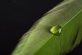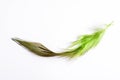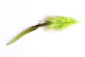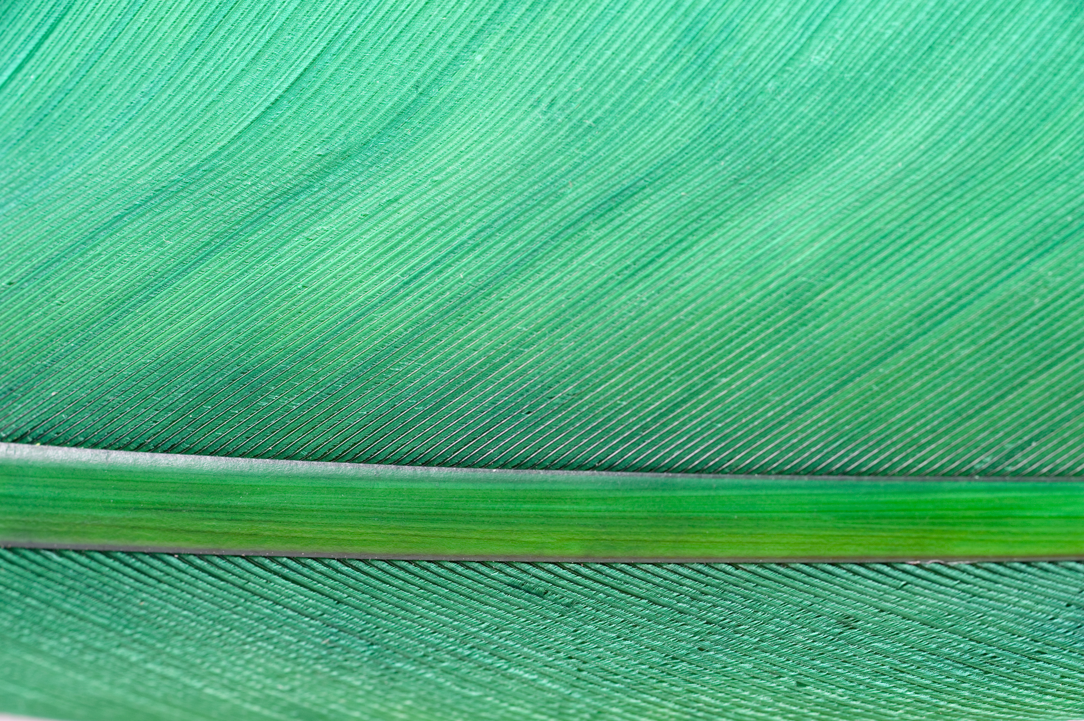 Image Description: Close up macro of a green feather showing the shaft and vanes in a decorative background with copy space