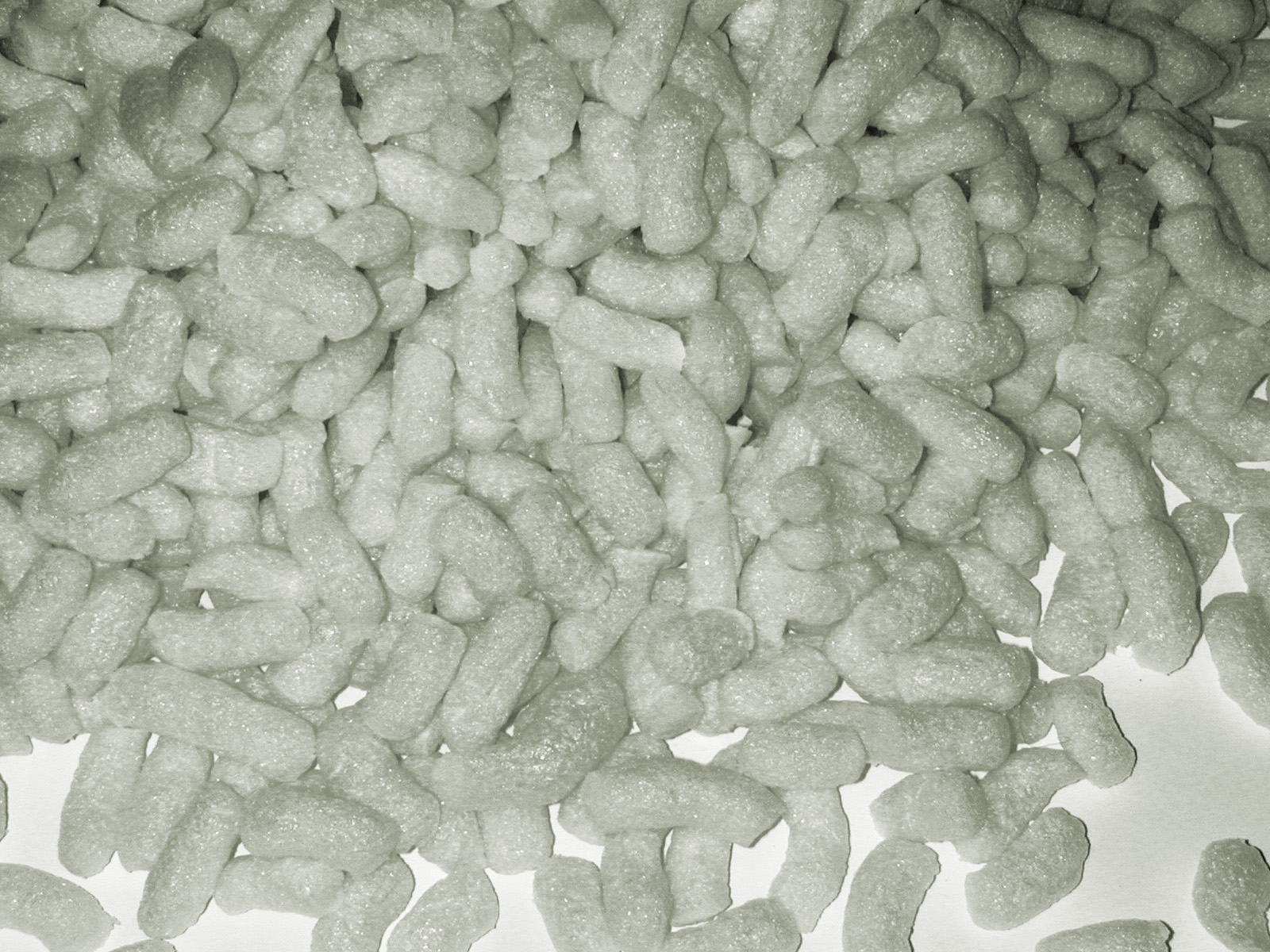 Image Description: Abstract background composed of foam peanuts as viewed from overhead on white