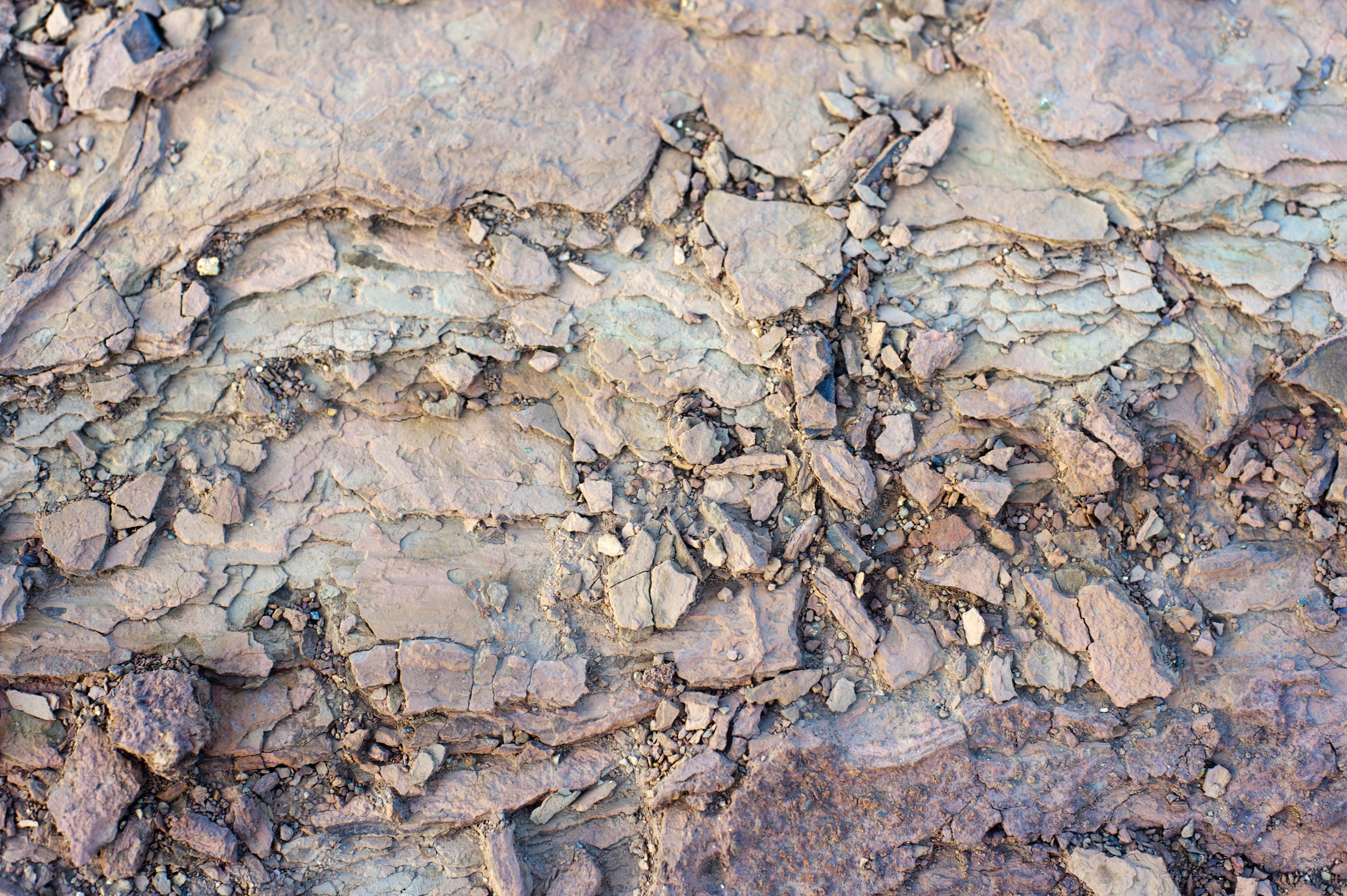Image Description: Top down view of cracked faded red flat stones with tiny pieces below larger ones