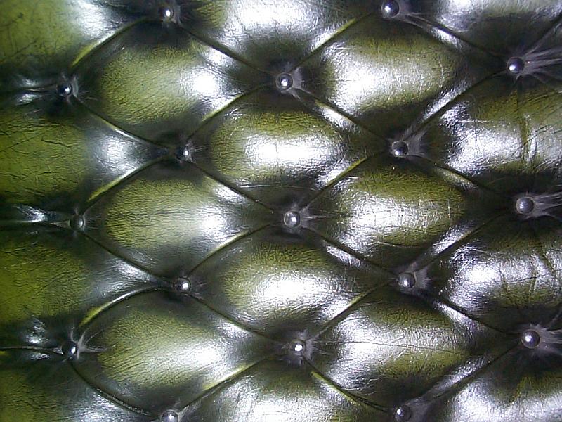 Image Description: Tightly cropped close up on dark green sofa back cushion with leather type upholstery