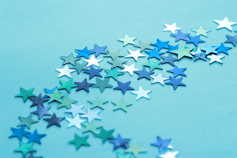 Image Description: Still Life of Blue and Silver Stars Scattered Across Teal Colored Background with Copy Space