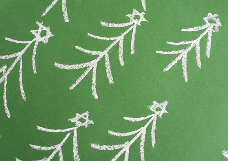 Image Description: Chalk hand-drawn Christmas trees forming a diagonal pattern on a green chalkboard for a festive Xmas background