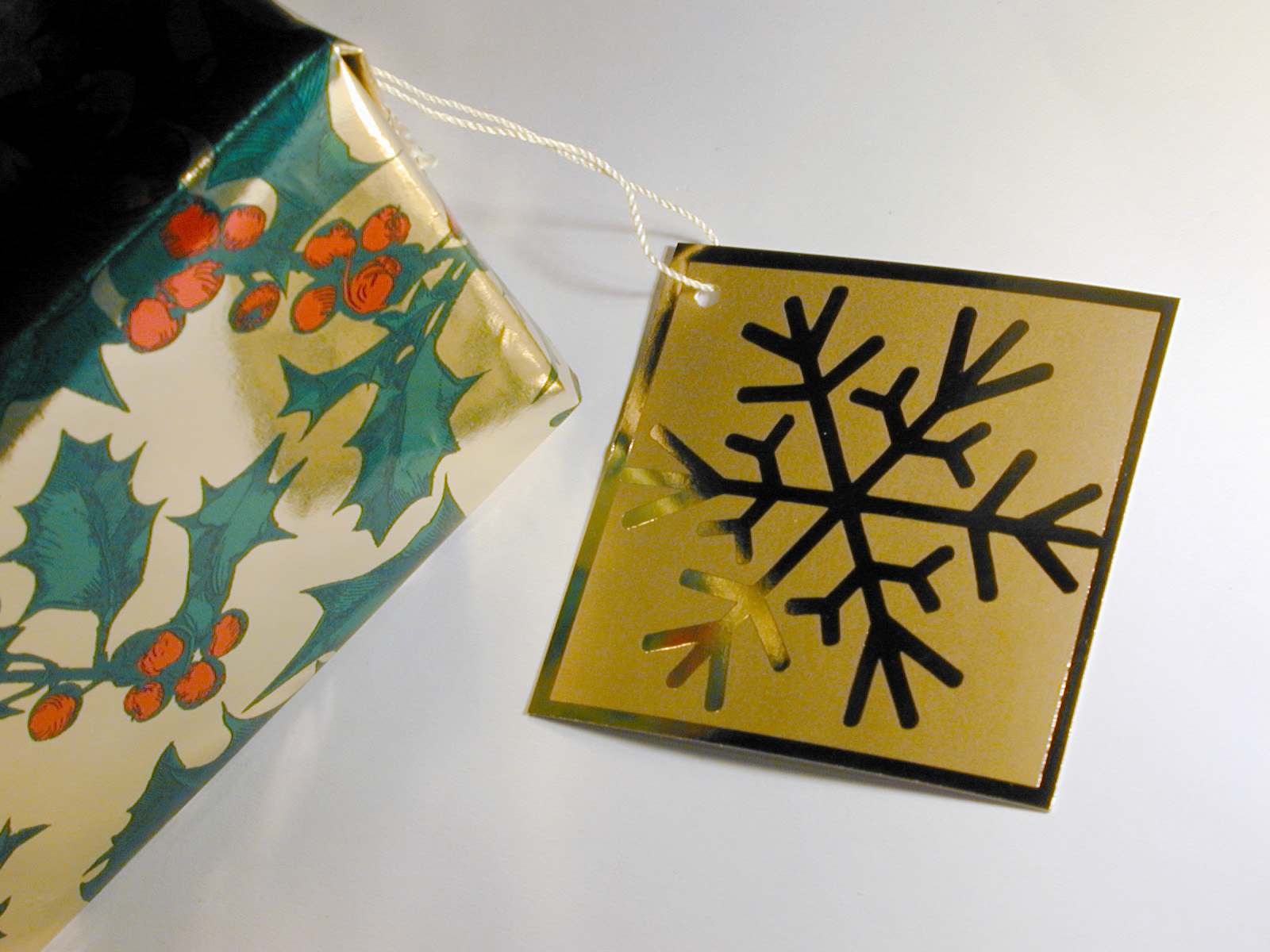 Image Description: High Angle View of Christmas Gift Wrapped in Paper with Mistletoe Motif and Attached Gift Tag with Snowflake Design in Gold