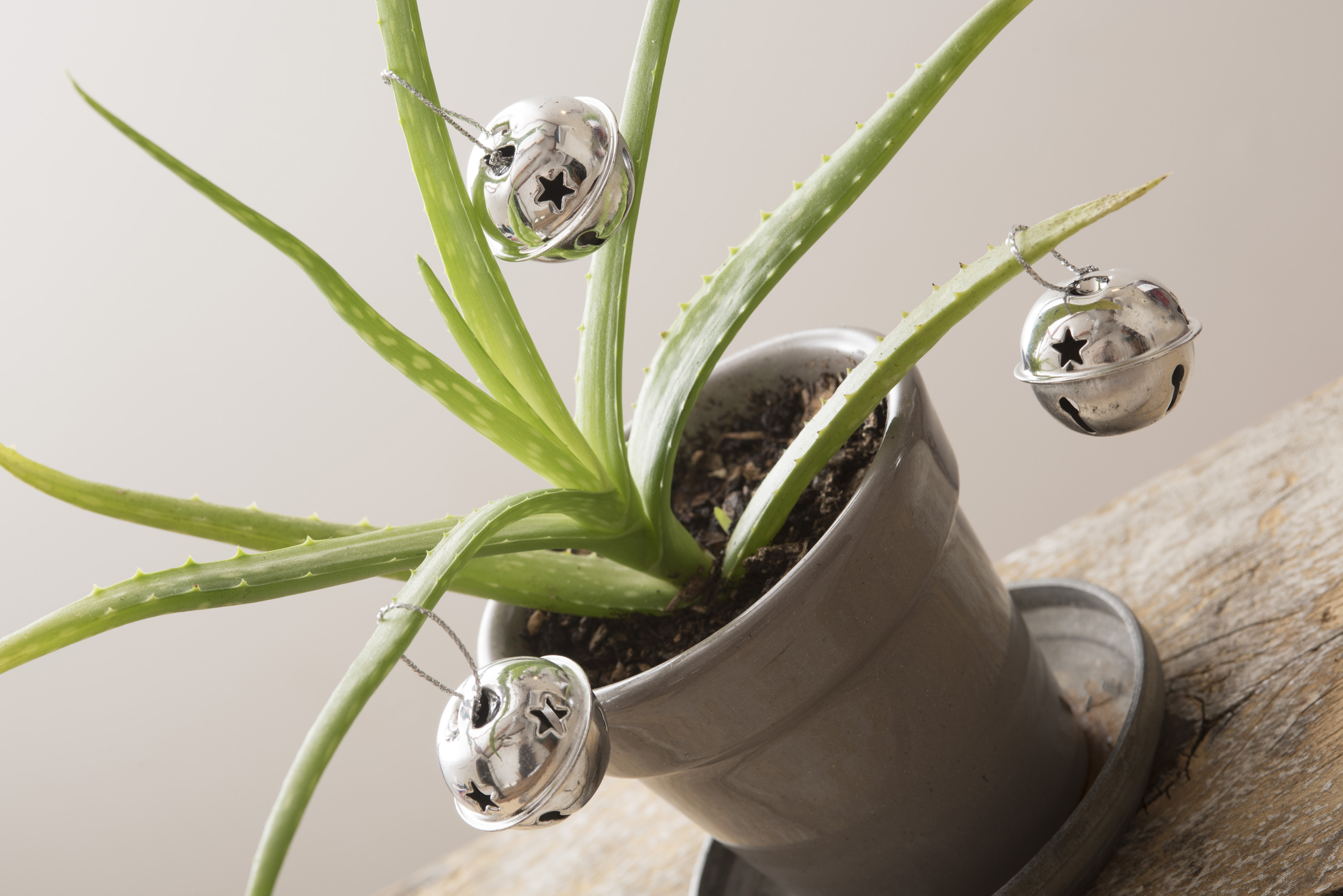 Image Description: angled view of a small plant decorated with silver christmas bells