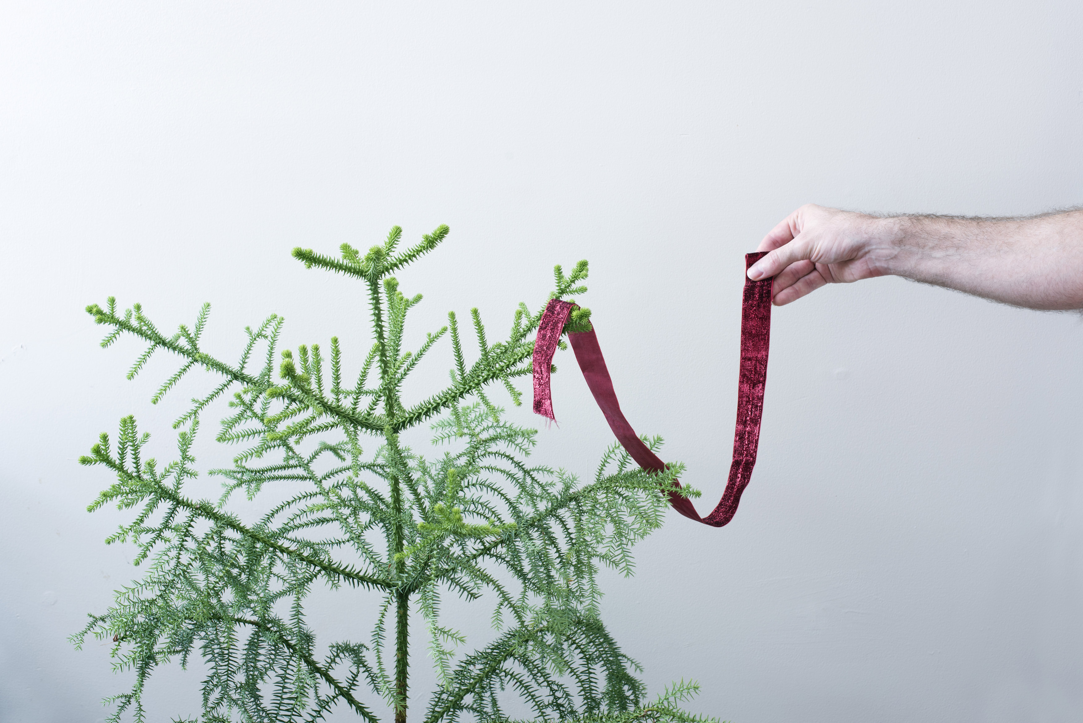 Image Description: Concept of austerity at Christmas with a lone red ribbon to decorate a small green pine Xmas tree