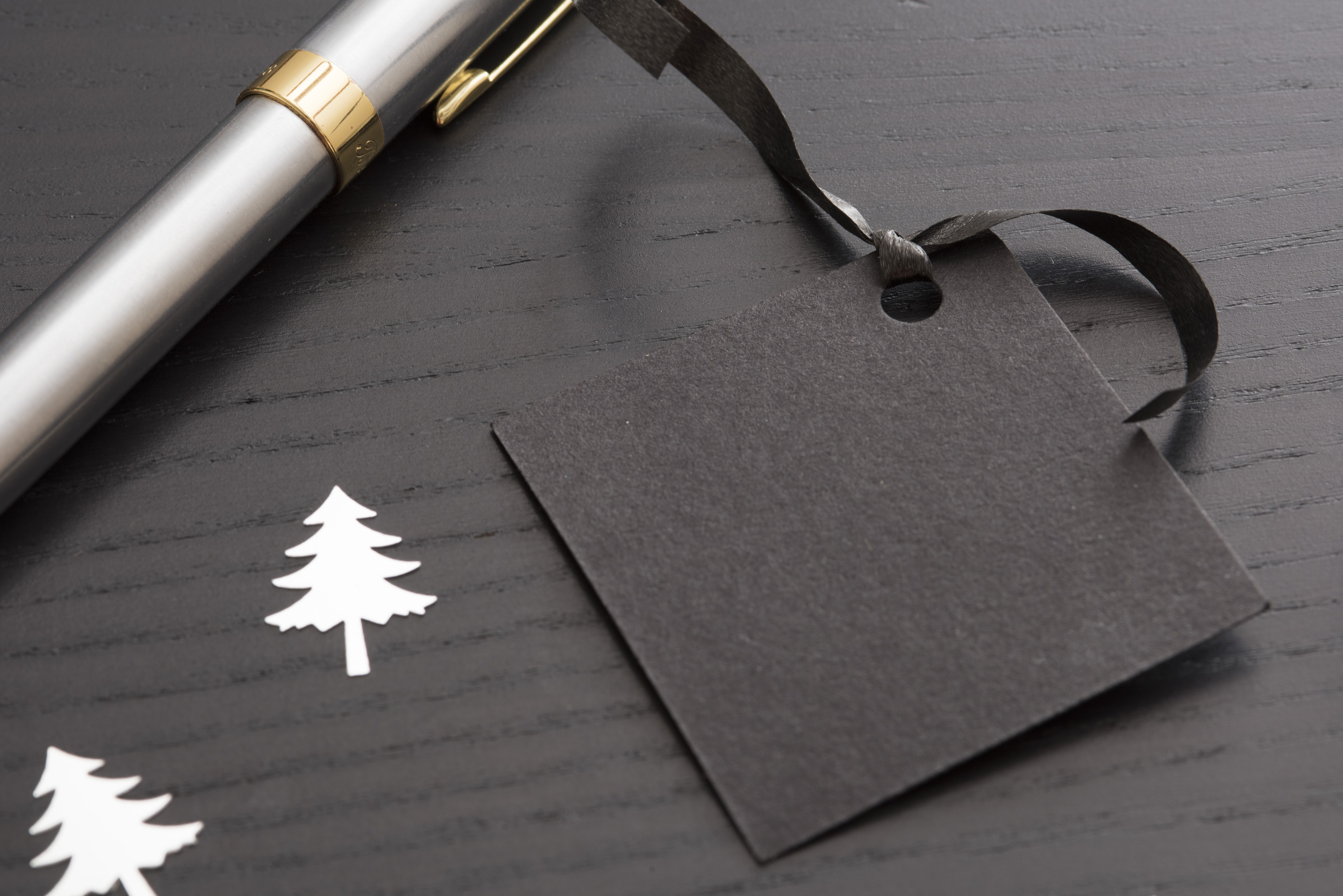Image Description: concept image of writing a gift label, a tag and pen with space for text on black background