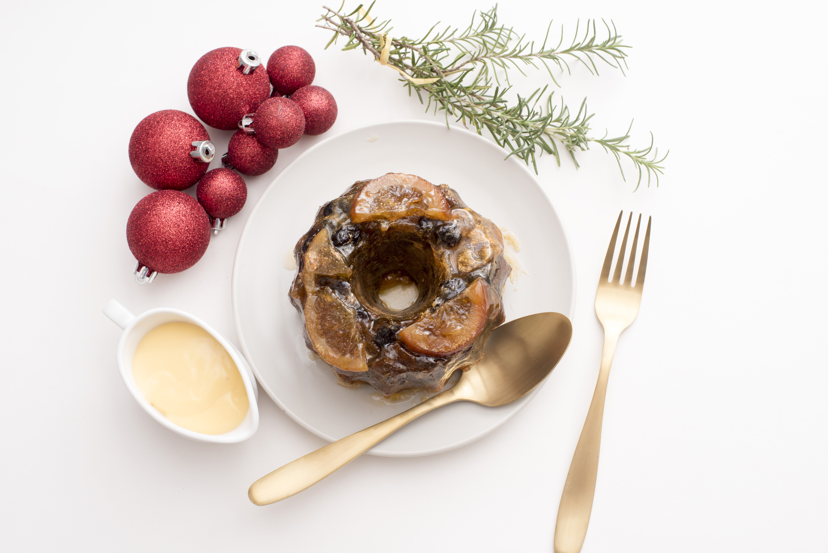 Image Description: a overhead view of a round traditional christmas fruit pudding with fruit decorations, served with sauce